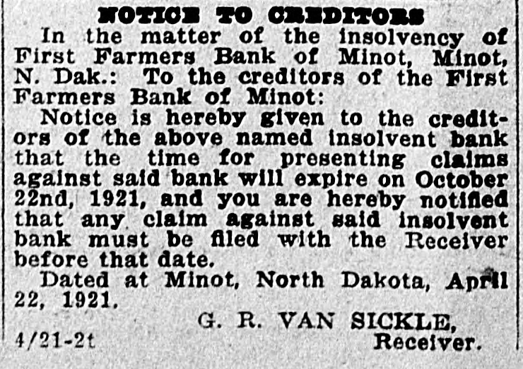 NOTICE TO CREDITORS In the matter of the insolvency of First Farmers Bank of Minot, Minot, N. Dak.: To the creditors of the First Farmers Bank of Minot: Notice is hereby given to the creditors of the above named insolvent bank that the time for presenting claims against said bank will expire on October 22nd, 1921, and you are hereby notified that any claim against said insolvent bank must be filed with the Receiver before that date. Dated at Minot, North Dakota, April 22, 1921. G. R. VAN SICKLE, 4/21-2t Receiver.