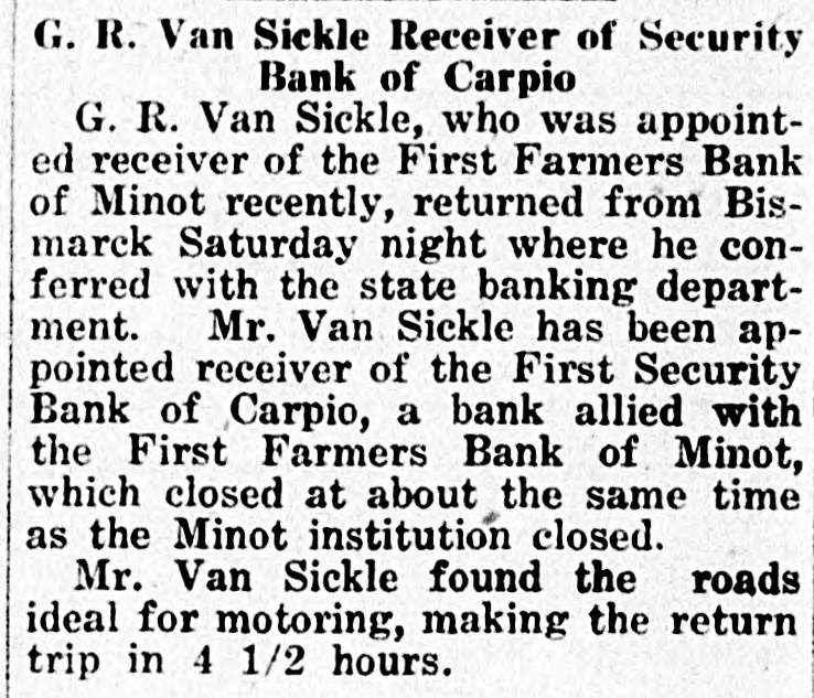 G. R. Van Sickle Receiver of Security Bank of Carpio G. R. Van Sickle, who was appointed receiver of the First Farmers Bank of Minot recently, returned from Bismarck Saturday night where he conferred with the state banking department. Mr. Van Sickle has been appointed receiver of the First Security Bank of Carpio, a bank allied with the First Farmers Bank of Minot, which closed at about the same time as the Minot institution closed. Mr. Van Sickle found the roads ideal for motoring, making the return trip in 4 1/2 hours.