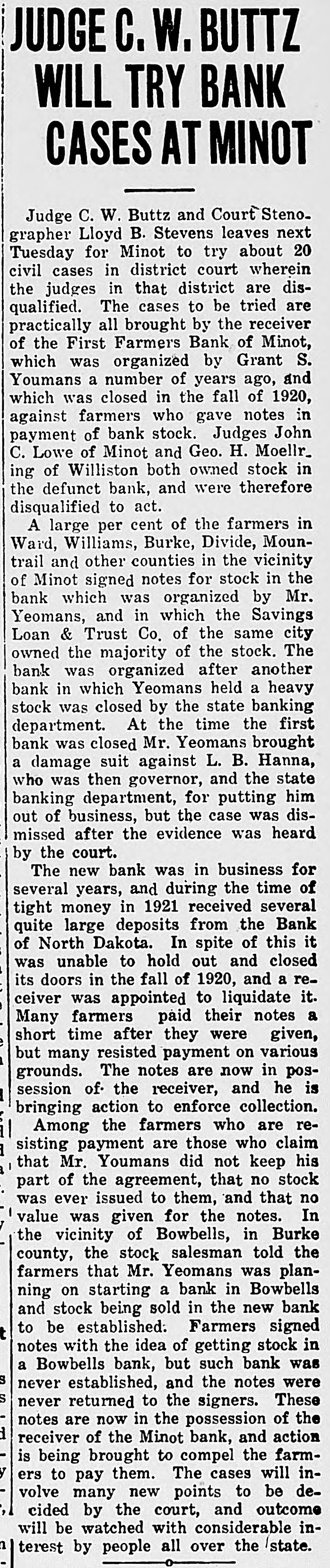 JUDGE C. W. BUTTZ WILL TRY BANK CASES AT MINOT Judge C. W. Buttz and Court Steno. grapher Lloyd B. Stevens leaves next Tuesday for Minot to try about 20 civil cases in district court wherein the judges in that district are disqualified. The cases to be tried are practically all brought by the receiver of the First Farmers Bank of Minot, which was organized by Grant S. Youmans a number of years ago, and which was closed in the fall of 1920, against farmers who gave notes in payment of bank stock. Judges John C. Lowe of Minot and Geo. H. Moellr_ ing of Williston both owned stock in the defunct bank, and were therefore disqualified to act. A large per cent of the farmers in Ward, Williams, Burke, Divide, Mountrail and other counties in the vicinity of Minot signed notes for stock in the bank which was organized by Mr. Yeomans, and in which the Savings Loan & Trust Co. of the same city owned the majority of the stock. The bank was organized after another bank in which Yeomans held a heavy stock was closed by the state banking department. At the time the first bank was closed Mr. Yeomans brought a damage suit against L. B. Hanna, who was then governor, and the state banking department, for putting him out of business, but the case was dismissed after the evidence was heard by the court. The new bank was in business for several years, and during the time of tight money in 1921 received several quite large deposits from the Bank of North Dakota. In spite of this it was unable to hold out and closed its doors in the fall of 1920, and a receiver was appointed to liquidate it. Many farmers paid their notes a short time after they were given, but many resisted payment on various grounds. The notes are now in possession of- the receiver, and he is bringing action to enforce collection. Among the farmers who are resisting payment are those who claim that Mr. Youmans did not keep his part of the agreement, that no stock was ever issued to them, and that no value was given for the notes. In the vicinity of Bowbells, in Burke county, the stock salesman told the farmers that Mr. Yeomans was planning on starting a bank in Bowbells and stock being sold in the new bank to be established: Farmers signed notes with the idea of getting stock in a Bowbells bank, but such bank was S never established, and the notes were S never returned to the signers. These notes are now in the possession of the 1 receiver of the Minot bank, and action is being brought to compel the farmy ers to pay them. The cases will involve many new points to be decided by the court, and outcome will be watched with considerable interest by people all over the state.