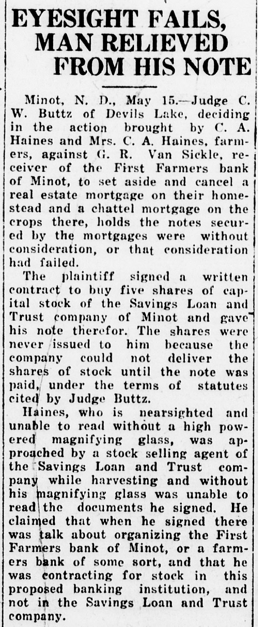 Haines, who is nearsighted and unable to read without a high powered magnifying glass, was approached by a stock selling agent of the Savings Loan and Trust company while harvesting and without his magnifying glass was unable to read the documents he signed. He claimed that when he signed there was talk about organizing the First Farmers bank of Minot, or a farmers bank of some sort, and that he was contracting for stock in this proposed banking institution, and not in the Savings Loan and Trust company.
