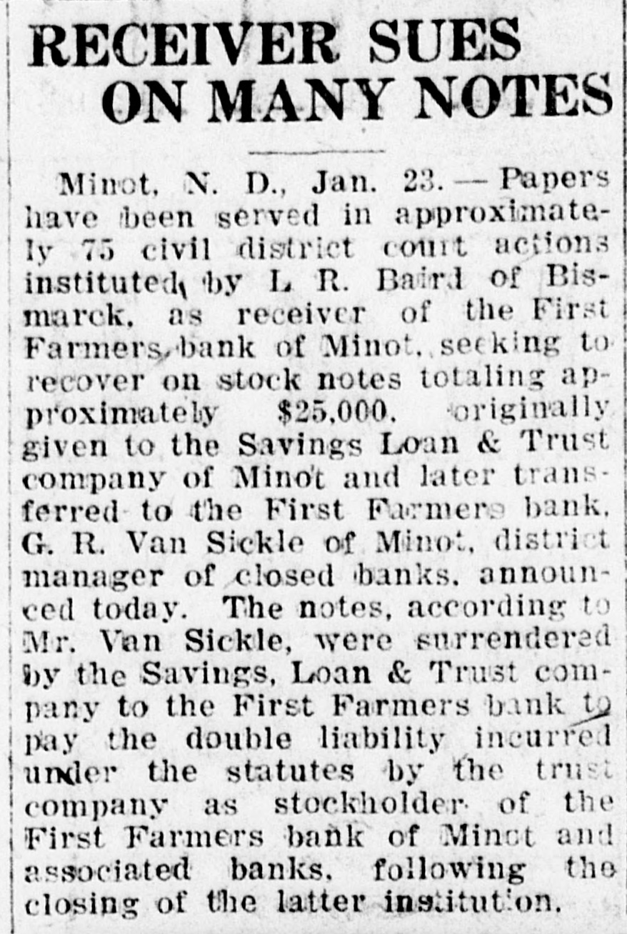 RECEIVER SUES ON MANY NOTES Minot, N. D., Jan. 23. - Papers have been served in approximately 75 civil district court actions instituted by L R. Baird of Bismarck, as receiver of the First Farmers bank of Minot. seeking to recover on stock notes totaling approximately $25,000. originally given to the Savings Loan & Trust company of Minot and later transferred to the First Farmers bank. G. R. Van Sickle of Minot, district manager of closed banks. announced today. The notes, according to Mr. Van Sickle, were surrendered by the Savings, Loan & Trust company to the First Farmers bank to pay the double liability incurred under the statutes by the trust company as stockholder- of the First Farmers bank of Minot and associated banks. following the closing of the latter institution.
