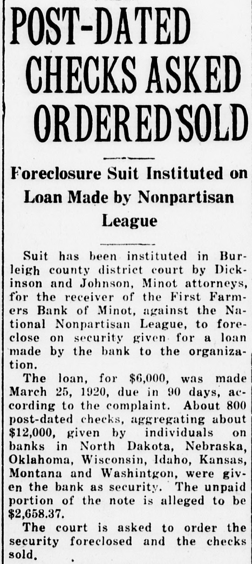The loan, for $6,000, was made March 25, 1920, due in 90 days, according to the complaint. About 800 post-dated checks, aggregating about $12,000, given by individuals on banks in North Dakota, Nebraska, Oklahoma, Wisconsin, Idaho, Kansas, Montana and Washintgon, were given the bank as security. The unpaid portion of the note is alleged to be $2,658.37.