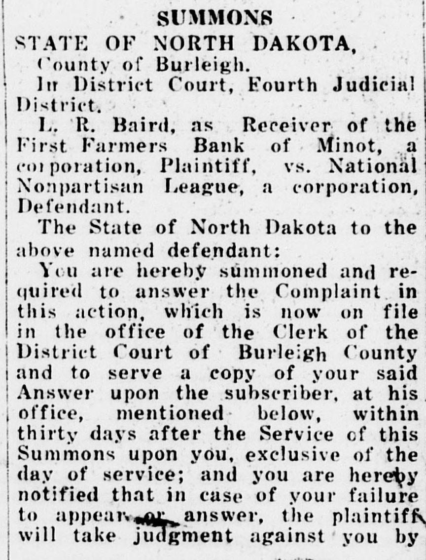 SUMMONS STATE OF NORTH DAKOTA, County of Burleigh. In District Court, Fourth Judicial District. L. R. Baird, as Receiver of the First Farmers Bank of Minot, a corporation, Plaintiff, vs. National Nonpartisan League, a corporation, Defendant. The State of North Dakota to the above named defendant: You are hereby summoned and required to answer the Complaint in this action, which is now on file in the office of the Clerk of the District Court of Burleigh County and to serve a copy of your said Answer upon the subscriber, at his office, mentioned below, within thirty days after the Service of this Summons upon you, exclusive of the day of service; and you are hereby notified that in case of your failure to appear or answer, the plaintiff will take judgment against you by