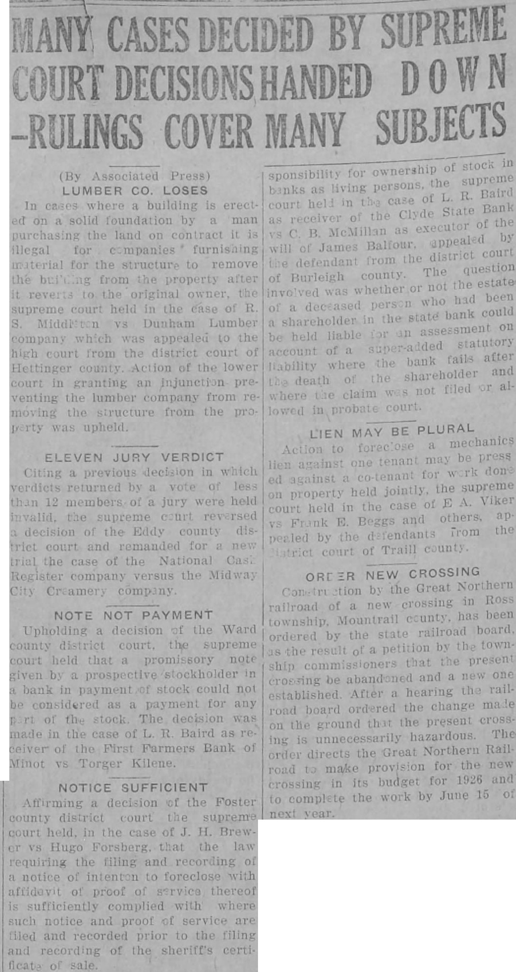 (By Associated Press) LUMBER CO. LOSES In cases where building is erect ed on a solid foundation by man purchasing the land on contract it is Illegal for companies furnishing miterial for the structure to remove the ng from the property after it reverts to the original owner the supreme court held in the case of R S. Middlaton vs Dunham Lumber company which was appealed to the high court from the district court of Hettinger county Action of the lower court in granting an injunction preventing the lumber company from re moving the structure from the proparty was upheld.