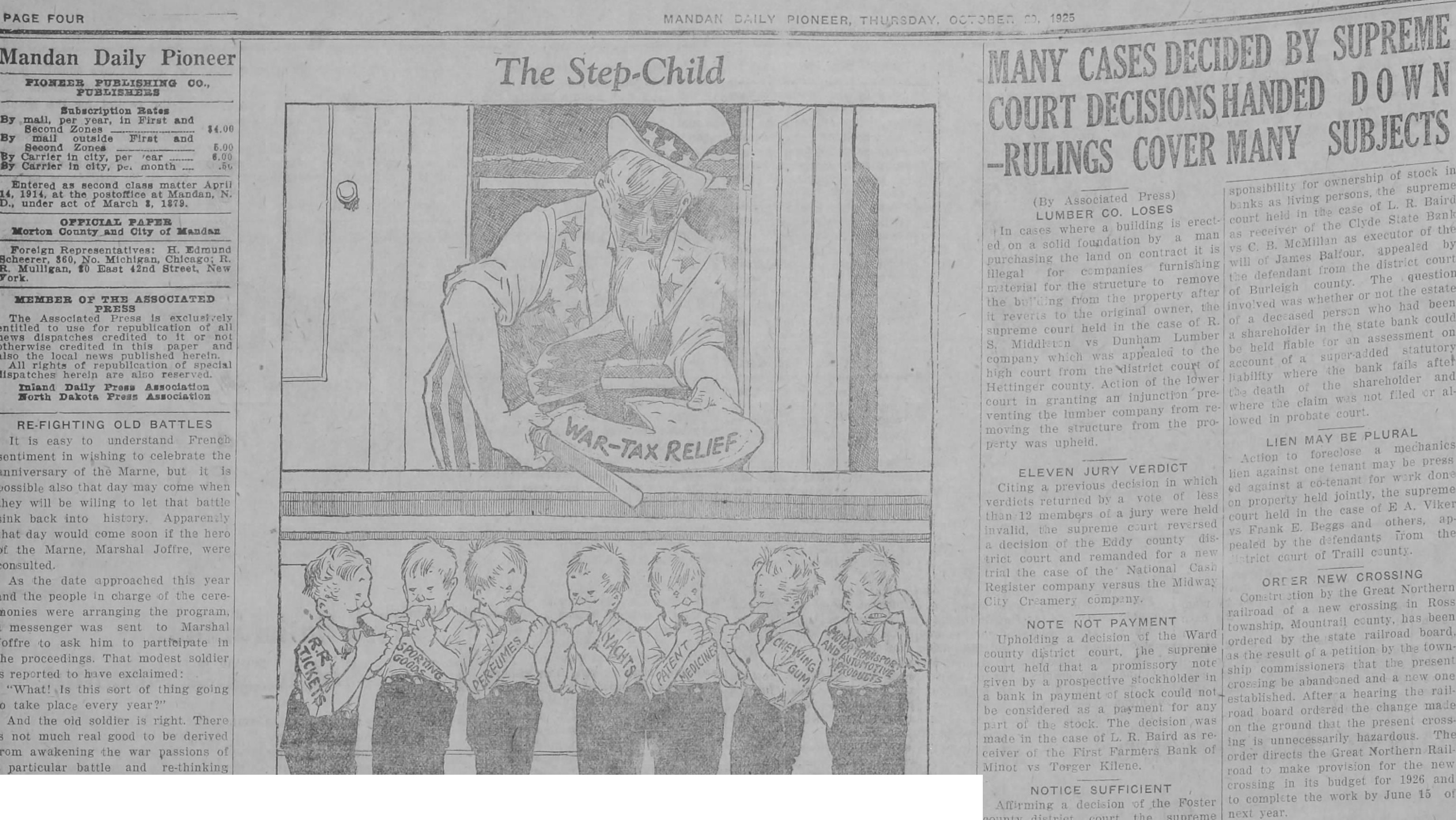 PAGE FOUR MANDAN DAILY PIONEER, THURSDAY OCTOBER 1925 Mandan Daily Pioneer MANY CASES DECIDED BY SUPREME W N The Step-Child PUBLISHERS HANDED DECISIONS Subscription Rates COURT By mail, per year, in First and Second Zones $4.00 SUBJECTS By mail outside First and MANY Second Zones COVER Carrier in city, per 'ear -RULINGS Carrier in city, per month