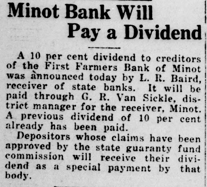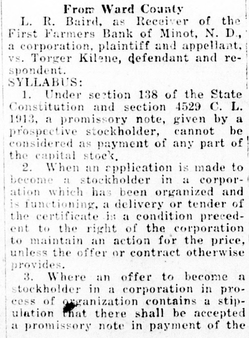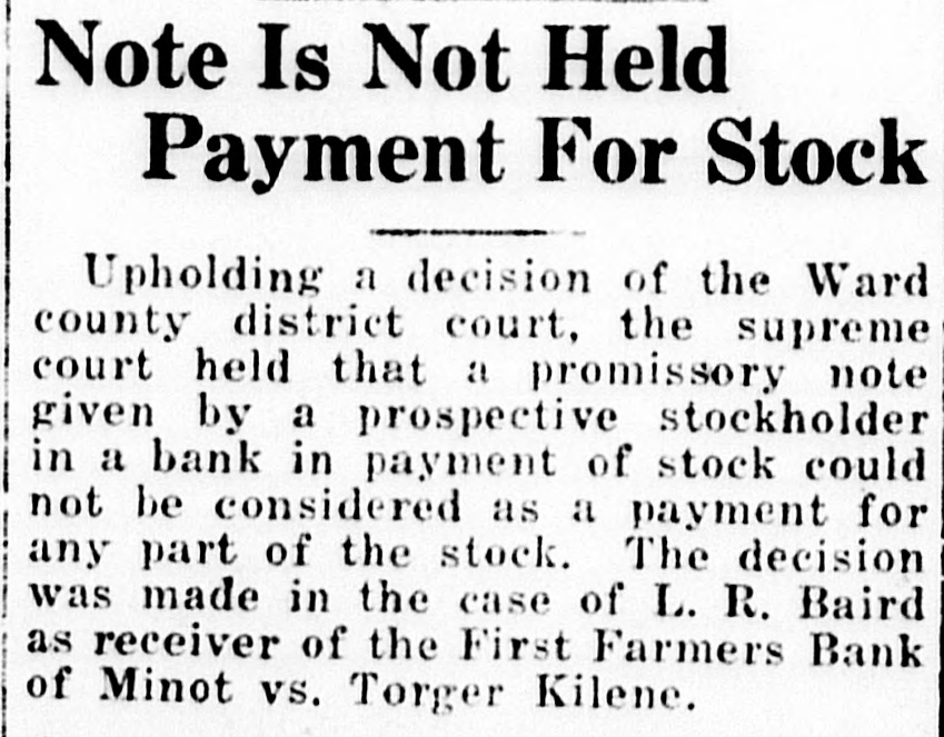 NOTE NOT PAYMENT Upholding a decision of the Ward county district court, the supreme court held that a promissory note given by a prospective stockholder in a bank in payment of stock could not. be considered as a payment for any part of the stock The decision was made in the case of L. R. Baird as receiver of the First Farmers Bank of Minot vs Torger Kilene sponsibility for ownership persons, the of supreme stock in living Baird banks as R. of L. the case held in Bank court State Clyde as receiver B. McMillan of the as executor of the by vs will C. of James Balfour, the district appealed court from defendant the question The county Burleigh estate of the or not whether was been had who person deceased could of bank the state in shareholder on assessment for an held liable be statutory super-added of account after fails the bank liability death where of the shareholder and the where claim was not filed or lowed in probate court