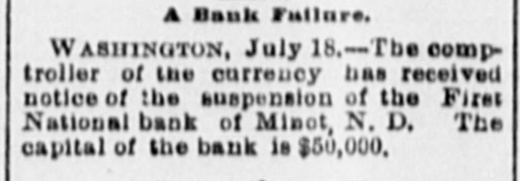 National Bank Suspends. WASHINGTON, July 18.-The Controller of the Currency has received notice of the suspension of the First National Bank of Minot, North Dakota. The capital of the bank is $50,000.