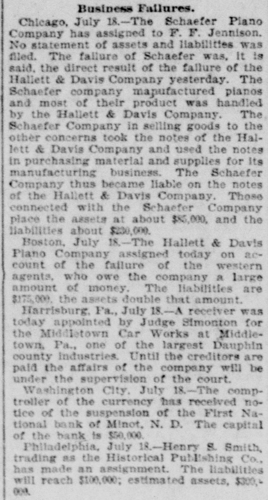 Business Failures. Chicago, July 18.-The Schaefer Plano Company has assigned to F. F. Jennison. No statement of assets and liabilities was filed. The failure of Schaefer was, It is said, the direct result of the failure of the Hallett & Davis Company yesterday. The Schaefer company mapufactured planos and most of their product was handled by the Hallett & Davis Company. The Schaefer Company in selling goods to the other concerns took the notes of the Hallett & Davis Company and used the notes in purchasing material and supplies for its manufacturing business. The Schaefer Company thus became liable on the notes of the Hallett & Davis Company. Those connected with the Schaefer Company place the assets at about $85,000, and the liabilities about $230,000. Boston, July 18.-The Hallett & Davis Plano Company assigned today on account of the failure of the western agents, who owe the company a large amount of money. The liabilities are $175,000. the assets double that amount. Harrisburg, Fa., July 18.-A receiver was today appointed by Judge Simonton for the Middletown Car Works at Middletown, Pa., one of the largest Dauphin county industries. Until the creditors are paid the affairs of the company will be under the supervision of the court. Washington City, July 18.-The comptroller of the currency has received notice of the suspension of the First National bank of Minot, N. D. The capital of the bank is $50,000. Philadelphia, July 18.-Henry 8. Smith, trading as the Historical Publishing Co., has made an assignment. The liabilities will reach $100,000; estimated assets, $300,4 009.