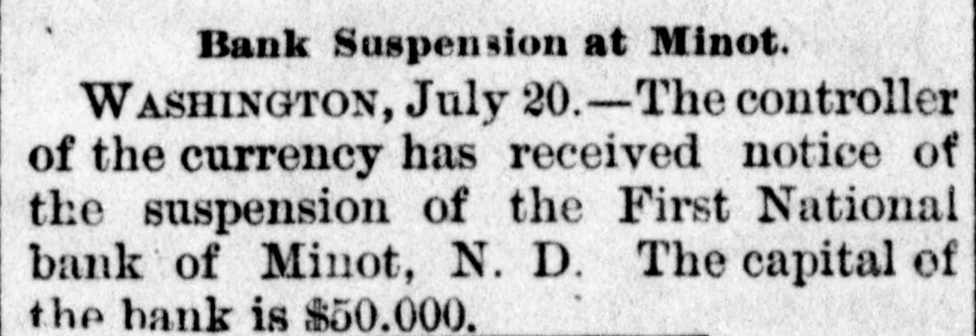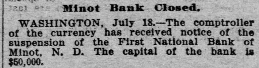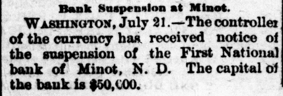 Bank Suspension at Minot. W ASHINGTON, July 21.-The controller of the currency has received notice of the suspension of the First National bank of Minot, N. D. The capital of the bank is $50,000.