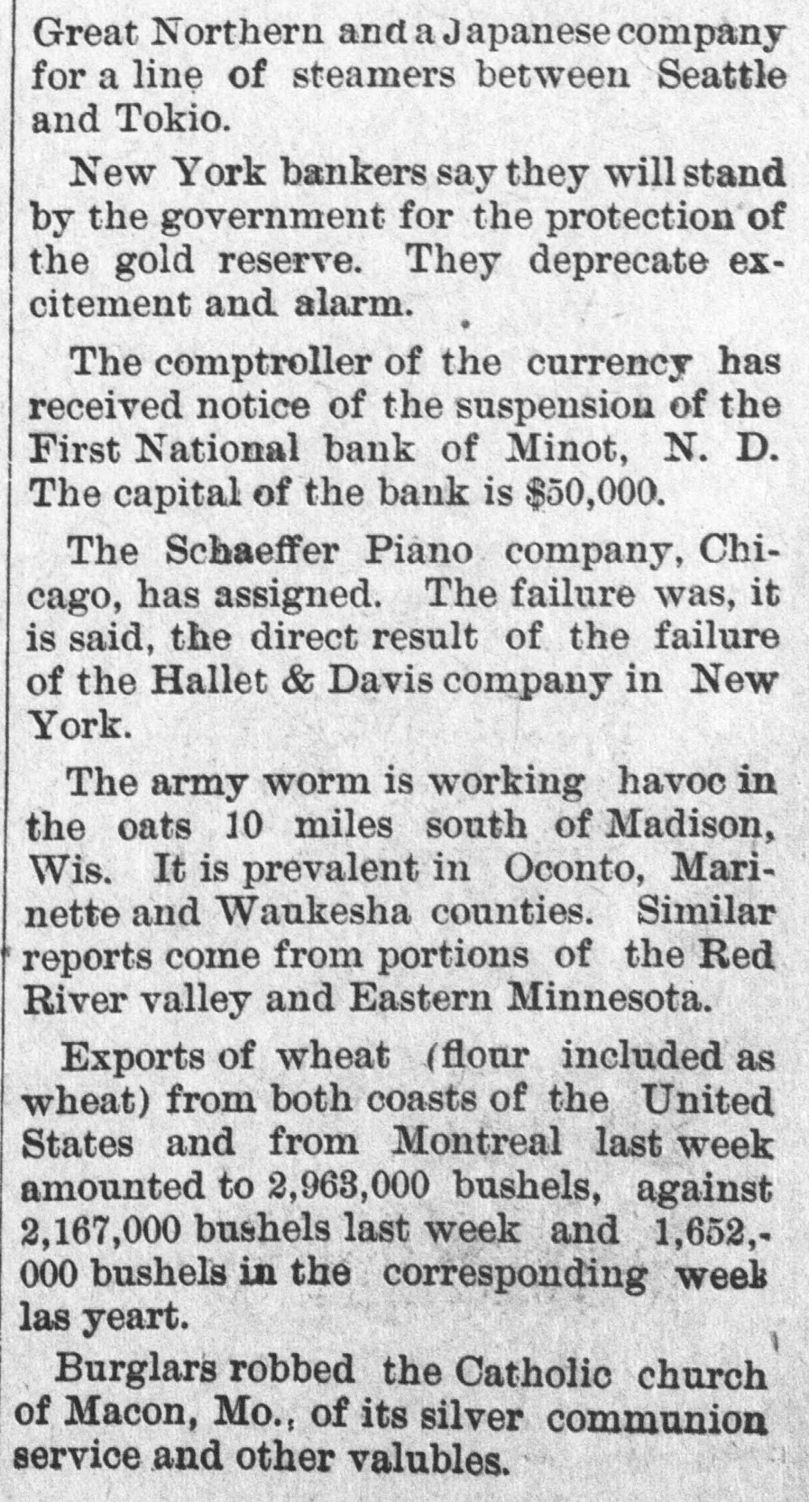 Great Northern and a Japanese company for a line of steamers between Seattle and Tokio. New York bankers say they will stand by the government for the protection of the gold reserve. They deprecate excitement and alarm. The comptroller of the currency has received notice of the suspension of the First National bank of Minot, N. D. The capital of the bank is $50,000. The Schaeffer Piano company, Chicago, has assigned. The failure was, it is said, the direct result of the failure of the Hallet & Davis company in New York. The army worm is working havoc in the oats 10 miles south of Madison, Wis. It is prevalent in Oconto, Marinette and Waukesha counties. Similar reports come from portions of the Red River valley and Eastern Minnesota. Exports of wheat (flour included as wheat) from both coasts of the United States and from Montreal last week amounted to 2,963,000 bushels, against 2,167,000 bushels last week and 1,652,000 bushels in the corresponding week las yeart. Burglars robbed the Catholic church of Macon, Mo., of its silver communion service and other valubles.