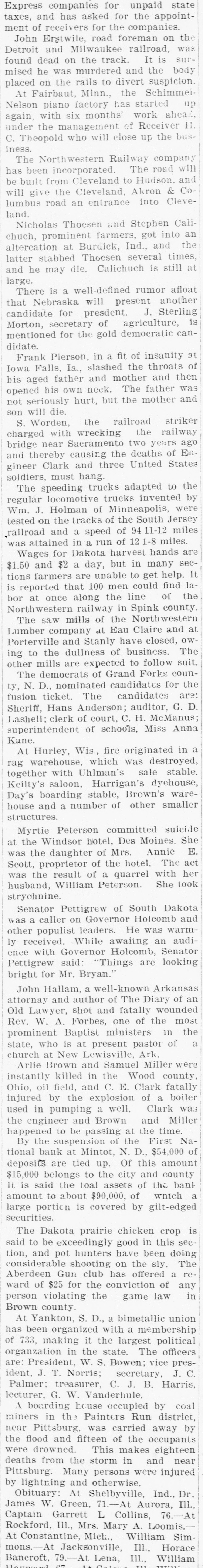 Northwestern Railway company incorporated. The road wil from Cleveland to Hudson, and the Cleveland, Akron & Co road an entrance into Cleve Thoesen and Stephen Cali prominent farmers, got into ai at Burdick, Ind., and th stabbed Thoesen several times may die. Calichuch is still a is a well-defined rumor afloa Nebraska will present anothe for presdent. J. Sterlin secretary of agriculture, i for the gold democratic can Pierson, in a fit of insanity a Falls, Ia., slashed the throats o father and mother and the his own neck. The father wa riously hurt, but the mother an die. Vorden, the railroad strike with wrecking the railwa near Sacramento two years ag ereby causing the deaths of En Clark and three United State must hang. speeding trucks adapted to th locomotive trucks invented b Holman of Minneapolis, wer on the tracks of the South Jerse and a speed of 94 11-12 mile ttained in a run of 12 1-8 miles. for Dakota harvest hands ar and $2 a day, but in many sec farmers are unable to get help. I that 100 men could find la once along the line of th western railway in Spink county saw mills of the Northwester company at Eau Claire and a ville and Stanly have closed, ow the dullness of business. Th mills are expected to follow suit democrats of Grand Forks coun D., nominated candidates for th ticket. The candidates are Hans Anderson; auditor, G. I clerk of court, C. H. McManus ntendent of schools, Miss Ann Hurley, Wis., fire originated in varehouse, which was destroyed with Uhlman's sale stable saloon, Harrigan's dyehouse boarding stable, Brown's ware and a number of other smalle Peterson committed suicid Windsor hotel, Des Moines. Sh daughter of Mrs. Annie E proprietor of the hotel. The ao he result of a quarrel with he William Peterson. She too Pettigrew of South Dakot caller on Governor Holcomb an populist leaders. He was warm While awaitng an audi with Governor Holcomb, Senato said: "Things are lookin for Mr. Bryan." Hallam, a well-known Arkansa and author of The Diary of a shot and fatally wounde A. Forbes, one of the mos Baptist ministers in th who is at present pastor of at New Lewisville, Ark. Brown and Samuel Miller wer killed in the Wood county field, and C. E. Clark fatall by the explosion of a boile pumping a well. Clark wa agineer and Brown and Mille to be passing at the time. the suspension of the First Na bank at Mintot, N. D., $54,000 o are tied up. Of this amoun belongs to the city and county said the toal assets of the banl to about $90,000, of which portion is covered by gilt-edge