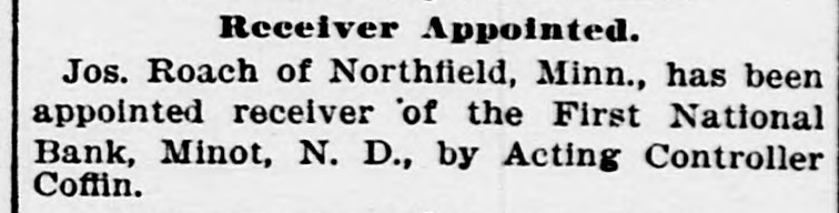 Receiver Appointed. Jos. Roach of Northfield, Minn., has been appointed receiver of the First National Bank, Minot, N. D., by Acting Controller Coffin.