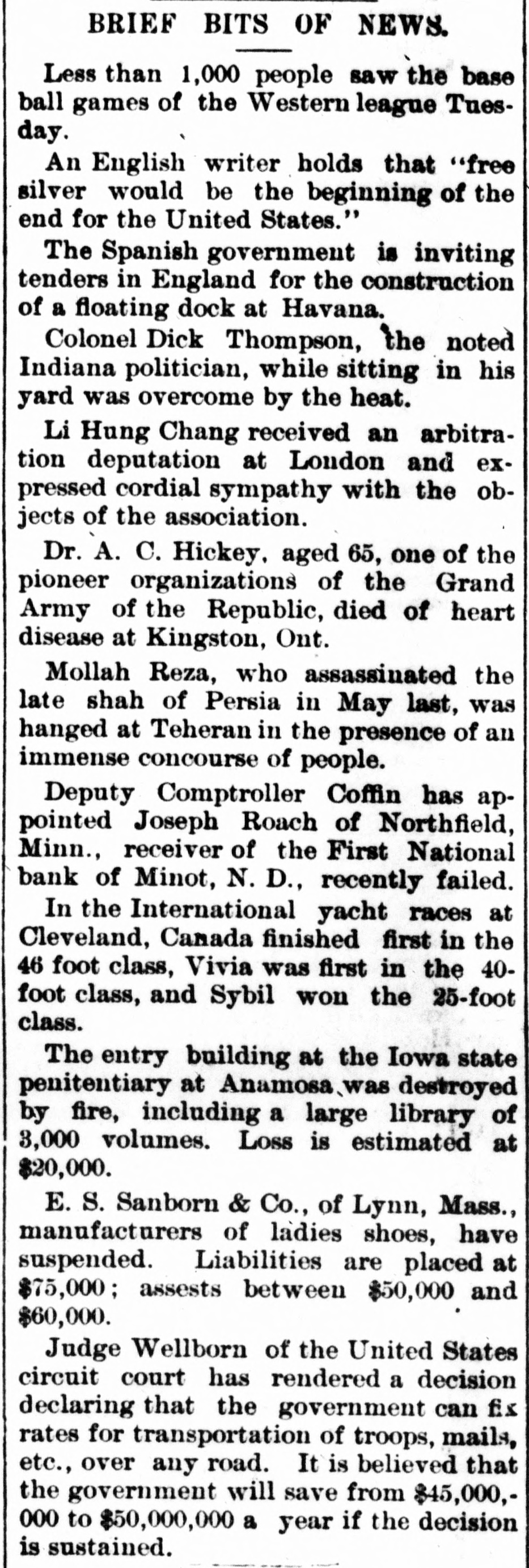 BRIEF BITS OF NEWS. Less than 1,000 people saw the base ball games of the Western league Tuesday. An English writer holds that "free silver would be the beginning of the end for the United States." The Spanish government is inviting tenders in England for the construction of a floating dock at Havana. Colonel Dick Thompson, the noted Indiana politician, while sitting in his yard was overcome by the heat. Li Hung Chang received an arbitration deputation at London and expressed cordial sympathy with the objects of the association. Dr. A. C. Hickey. aged 65, one of the pioneer organizations of the Grand Army of the Republic, died of heart disease at Kingston, Ont. Mollah Reza, who assassinated the late shah of Persia in May last, was hanged at Teheran in the presence of an immense concourse of people. Deputy Comptroller Coffin has appointed Joseph Roach of Northfield, Minn., receiver of the First National bank of Minot, N. D., recently failed. In the International yacht races at Cleveland, Canada finished first in the 46 foot class, Vivia was first in the 40foot class, and Sybil won the 25-foot class. The entry building at the Iowa state penitentiary at Anamosa was destroyed by fire, including a large library of 3,000 volumes. Loss is estimated at $20,000. E. S. Sanborn & Co., of Lynn, Mass., manufacturers of ladies shoes, have suspended. Liabilities are placed at $75,000; assests between $50,000 and $60,000. Judge Wellborn of the United States circuit court has rendered a decision declaring that the government can fix rates for transportation of troops, mails, etc., over any road. It is believed that the government will save from $45,000,000 to $50,000,000 a year if the decision is sustained.