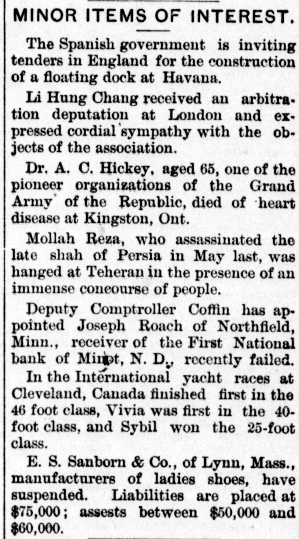 MINOR ITEMS OF INTEREST. The Spanish government is inviting tenders in England for the construction of a floating dock at Havana. Li Hung Chang received an arbitra. tion deputation at London and expressed cordial sympathy with the objects of the association. Dr. A. C. Hickey, aged 65, one of the pioneer organizations of the Grand Army of the Republic, died of heart disease at Kingston, Ont. Mollah Reza, who assassinated the late shah of Persia in May last, was hanged at Teheran in the presence of an immense concourse of people. Deputy Comptroller Coffin has appointed Joseph Roach of Northfield, Minn., receiver of the First National bank of Minot, N. D., recently failed. In the International yacht races at Cleveland, Canada finished first in the 46 foot class, Vivia was first in the 40foot class, and Sybil won the 25-foot class. E. S. Sanborn & Co., of Lynn, Mass., manufacturers of ladies shoes, have suspended. Liabilities are placed at $75,000; assests between $50,000 and $60,000.