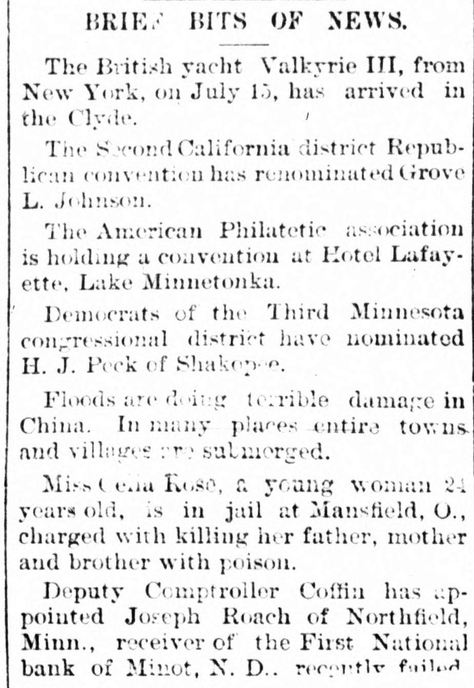 BRIEF BITS OF NEWS. The British yacht Valkyrie III, from New York, on July 15, has arrived in / the Clyde. The Second California district Republican convention has renominated Grove L. Johnson. The American Philatetic association is holding a convention at Hotel Lafayette, Lake Minnetonka. Democrats of the Third Minnesota congressional district have nominated H. J. Peck of Shakopee. Floods are doing terrible damage in China. In many places entire towns and villages are submerged. Miss ( ena Rose, a young woman 24 years old, is in jail at Mansfield, O., charged with killing her father, mother and brother with poison. Deputy Comptroller Coffin has uppointed Joseph Roach of Northfield, Minn., receiver of the First National bank of Minot, N. D.. recently failed