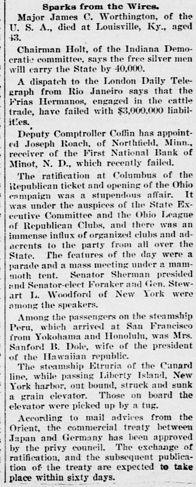 Sparks from the Wires. Major James C. Worthington, of the U. S. A., died at Louisville, Ky., aged 43. Chairman Holt, of the Indiana Democratie committee, says the free silver men will carry the State by 40,000. A dispatch to the London Daily Telegraph from Rio Janeiro says that the Frias Hermanos, engaged in the cattle trade, have failed with $3,000,000 liabilities. Deputy Comptroller Coffin has appointed Joseph Roach, of Northfield, Minn., receiver of the First National Bank of Minot, N. D., which recently failed. The ratification at Columbus of the Republican ticket and opening of the Ohio campaign was a stupendous affair. It was under the auspices of the State Executive Committee and the Ohio League of Republican Clubs, and there was an immense influx of organized clubs and adherents to the party from all over the State. The features of the day were a parade and a mass meeting under a mammoth tent. Senator Sherman presided and Senator-elect Foraker and Gen. Stewart L. Woodford of New York were among the speakers. Among the passengers on the steamship Peru, which arrived at San Francisco from Yokohama and Honolulu, was Mrs. Sanford B. Dole, wife of the president of the Hawaiian republic. The steamship Etruria of the Canard line, while passing Liberty Island, New York harbor, out bound, struck and sunk a grain elevator. Those on board the elevator were picked up by a tug. According to mail advices from the Orient, the commercial treaty between Japan and Germany has been approved by the privy council. The exchange of ratification, and the subsequent publication of the treaty are expected to take place within sixty days.