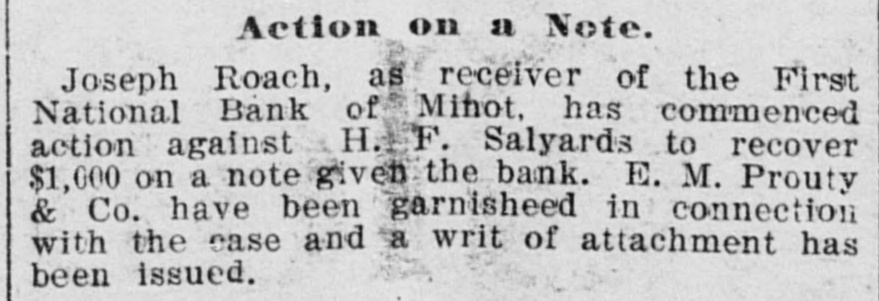 Action on a Note. Joseph Roach, as receiver of the First National Bank of Minot, has commenced action against H. F. Salyards to recover $1,000 on a note given the bank. E. M. Prouty & Co. have been garnisheed in connection with the case and a writ of attachment has been issued.