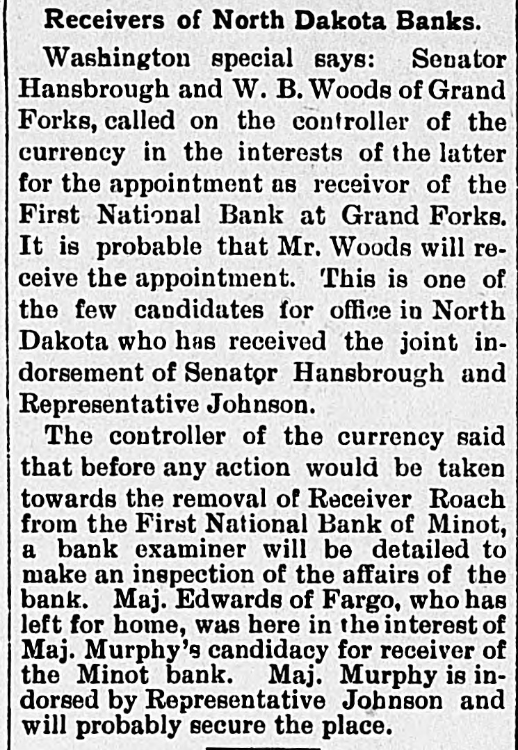 Receivers of North Dakota Banks. Washington special says: Senator Hansbrough and W. B. Woods of Grand Forks, called on the controller of the currency in the interests of the latter for the appointment as receivor of the First National Bank at Grand Forks. It is probable that Mr. Woods will receive the appointment. This is one of the few candidates for office in North Dakota who has received the joint indorsement of Senator Hansbrough and Representative Johnson. The controller of the currency said that before any action would be taken towards the removal of Receiver Roach from the First National Bank of Minot, a bank examiner will be detailed to make an inspection of the affairs of the bank. Maj. Edwards of Fargo, who has left for home, was here in the interest of Maj. Murphy's candidacy for receiver of the Minot bank. Maj. Murphy is indorsed by Representative Johnson and will probably secure the place.