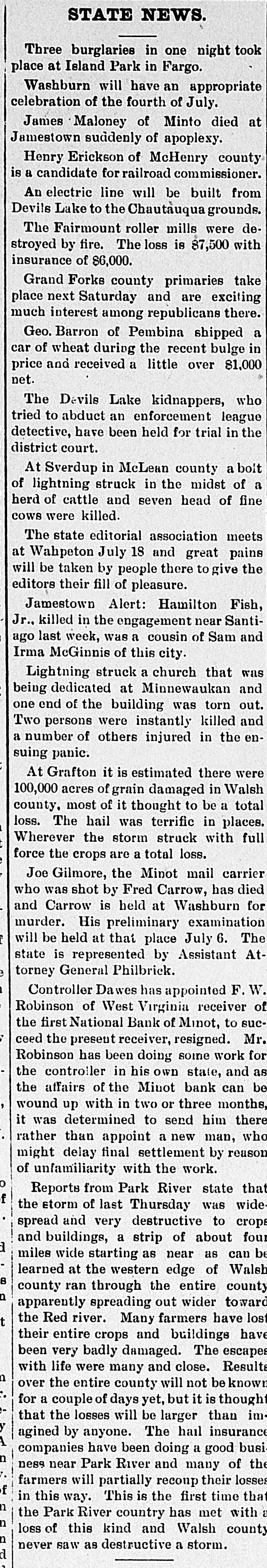 STATE NEWS. Three burglaries in one night took place at Island Park in Fargo. Washburn will have an appropriate celebration of the fourth of July. James Maloney of Minto died at Jamestown suddenly of apoplexy. Henry Erickson of McHenry county is a candidate for railroad commissioner. An electric line will be built from Devils Lake to the Chautauqua grounds. The Fairmount roller mills were destroyed by fire. The loss is $7,500 with insurance of $6,000. Grand Forks county primaries take place next Saturday and are exciting much interest among republicans there. Geo. Barron of Pembina shipped a car of wheat during the recent bulge in price and received a little over $1,000 net. The Devils Lake kidnappers, who tried to abduct an enforcement league detective, have been held for trial in the district court. At Sverdup in McLean county a boit of lightning struck in the midst of a herd of cattle and seven head of fine cows were killed. The state editorial association meets at Wahpeton July 18 and great pains will be taken by people there to give the editors their fill of pleasure. Jamestown Alert: Hamilton Fish, Jr., killed in the engagement near Santiago last week, was a cousin of Sam and Irma McGinnis of this city. Lightning struck a church that was being dedicated at Minnewaukan and one end of the building was torn out. Two persons were instantly killed and a number of others injured in the ensuing panic. At Grafton it is estimated there were 100,000 acres of grain damaged in Walsh county. most of it thought to be a total loss. The hail was terrific in places. Wherever the storm struck with full force the crops are a total loss. Joe Gilmore, the Minot mail carrier who was shot by Fred Carrow, has died and Carrow is held at Washburn for murder. His preliminary examination will be held at that place July 6. The state is represented by Assistant Attorney General Philbrick. Controller Dawes has appointed F. Robinson of West Virginia receiver of the first National Bank of Minot, to succeed the present receiver, resigned. Mr. Robinson has been doing some work for the controller in his own state, and as the affairs of the Minot bank can be wound up with in two or three months, it was determined to send him there rather than appoint a new man, who might delay final settlement by reason of unfamiliarity with the work. 0 Reports from Park River state that f the storm of last Thursday was wide spread and very destructive to crops and buildings, a strip of about four miles wide starting as near as can be learned at the western edge of Walsh county ran through the entire county apparently spreading out wider toward the Red river. Many farmers have lost their entire crops and buildings have been very badly damaged. The escapes with life were many and close. Resulte over the entire county will not be known for a couple of days yet, but it is though that the losses will be larger than im agined by anyone. The hail insurance companies have been doing a good busi ness near Park River and many of the farmers will partially recoup their losses f in this way. This is the first time tha the Park River country has met with loss of this kind and Walsh county never saw as destructive a storm.