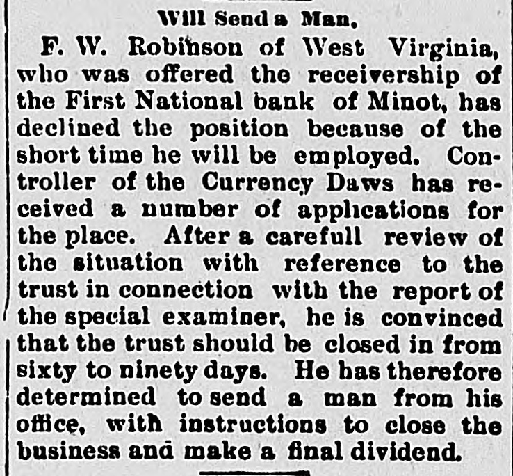 will Send a Man. F. W. Robinson of West Virginia, who was offered the receivership of the First National bank of Minot, has declined the position because of the short time he will be employed. Controller of the Currency Daws has received a number of applications for the place. After a carefull review of the situation with reference to the trust in connection with the report of the special examiner, he is convinced that the trust should be closed in from sixty to ninety days. He has therefore determined to send a man from his office, with instructions to close the business and make a final dividend.