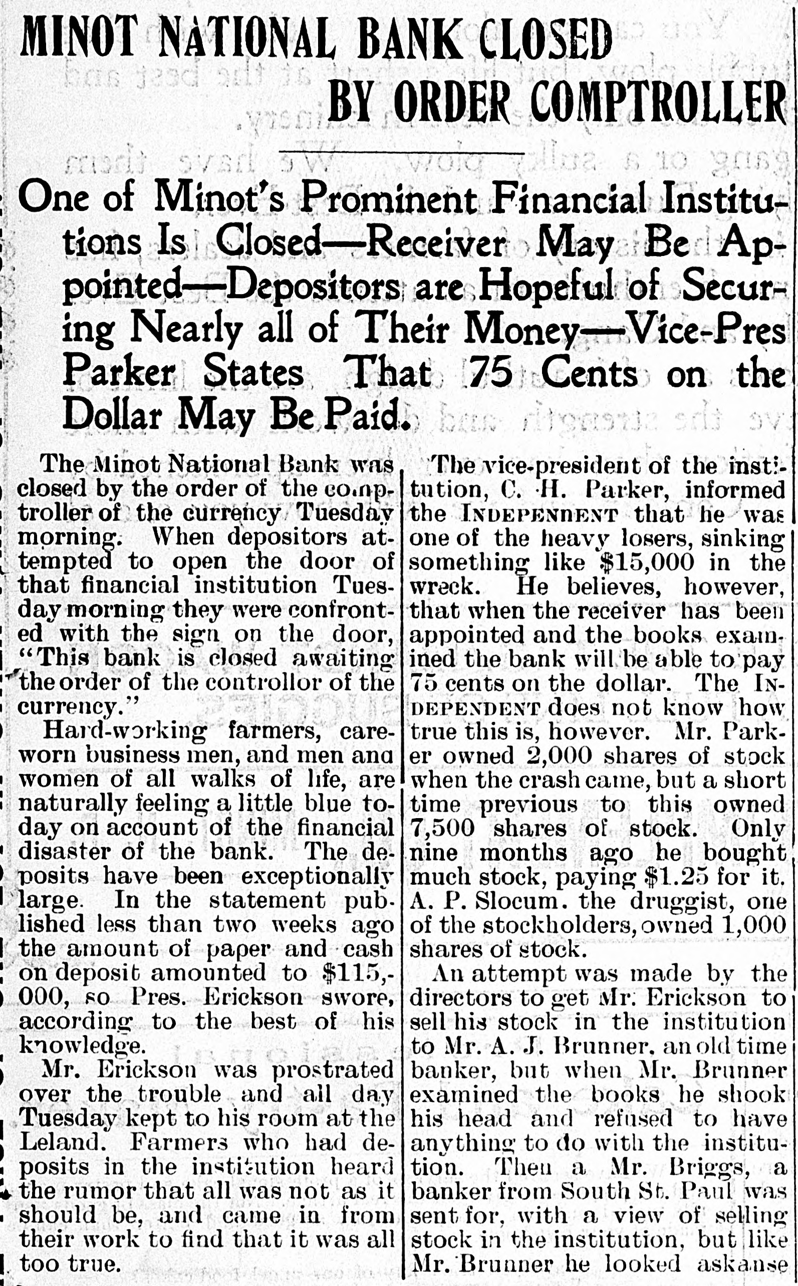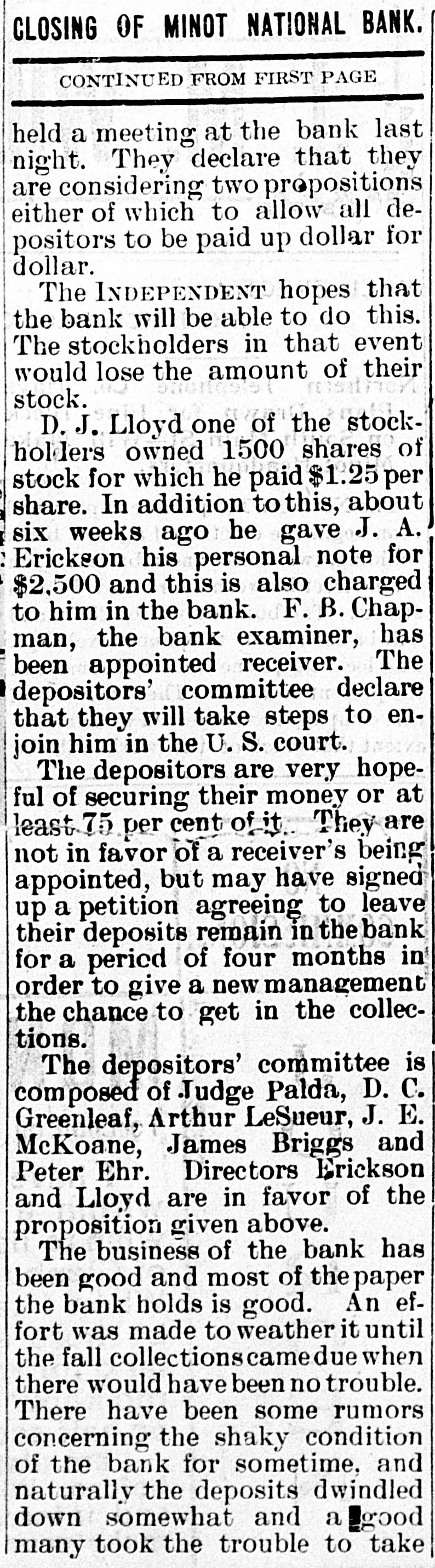 CLOSING OF MINOT NATIONAL BANK. CONTINUED FROM FIRST PAGE held a meeting at the bank last night. They declare that they are considering two propositions either of which to allow all depositors to be paid up dollar for dollar. The INDEPENDENT hopes that the bank will be able to do this. The stockholders in that event would lose the amount of their stock. D. J. Lloyd one of the stockholders owned 1500 shares of stock for which he paid $1.25 per share. In addition to this, about six weeks ago he gave J. A. Erickson his personal note for $2,500 and this is also charged to him in the bank. F. B. Chapman, the bank examiner, has been appointed receiver. The depositors' committee declare that they will take steps to enjoin him in the U. S. court. The depositors are very hopeful of securing their money or at least 75 per cent of it They are not in favor of a receiver's being appointed, but may have signed up a petition agreeing to leave their deposits remain in the bank for a period of four months in order to give a new management the chance to get in the collections. The depositors' committee is composed of Judge Palda, D. C. Greenleaf, Arthur LeSueur, J. E. McKoane, James Briggs and Peter Ehr. Directors Erickson and Lloyd are in favor of the proposition given above. The business of the bank has been good and most of the paper the bank holds is good. An effort was made to weather it until the fall collections came due when there would have been no trouble. There have been some rumors concerning the shaky condition of the bank for sometime, and naturally the deposits dwindled down somewhat and a good many took the trouble to take