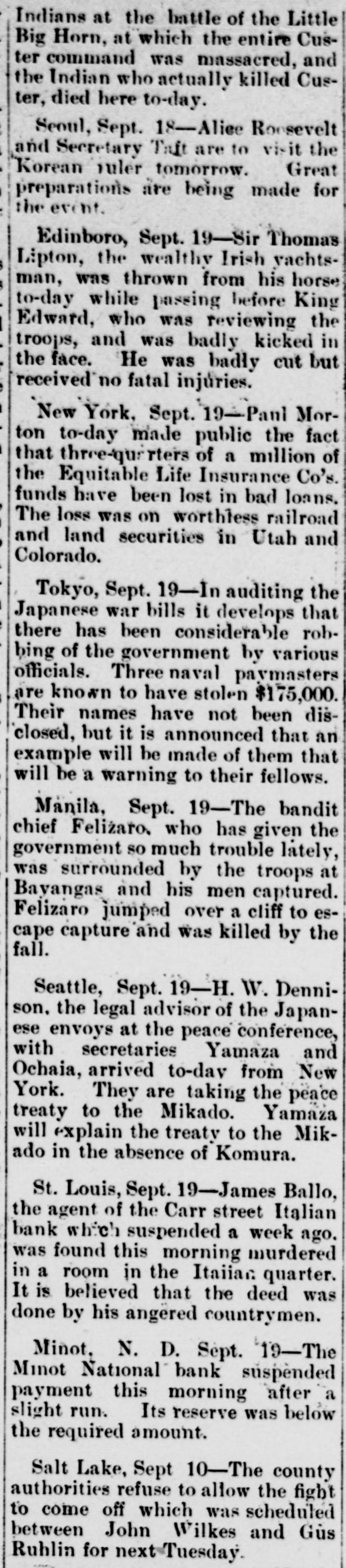 Indians at the battle of the Little Big Horn, at which the entire Custer command was massacred, and the Indian who actually killed Custer, died here to-day. Seoul, Sept. 18-Aliee Roosevelt and Secretary Taft are to visit the Korean ruler tomorrow. Great preparations are being made for the event. Edinboro, Sept. 19-Sir Thomas Lipton, the wealthy Irish yachtsman, was thrown from his horse to-day while passing before King Edward, who was reviewing the troops, and was badly kicked in the face. He was badly cut but received no fatal injuries. New York, Sept. 19-Pani Morton to-day made public the fact that three-quirters of a million of the Equitable Life Insurance Co's. funds have been lost in bad loans. The loss was on worthless railroad and land securities in Utah and Colorado. Tokyo, Sept. 19-In auditing the Japanese war bills it develops that there has been considerable robbing of the government by various officials. Three naval paymasters are known to have stolen $175,000. Their names have not been disclosed, but it is announced that an example will be made of them that will be a warning to their fellows. Manila, Sept. 19-The bandit chief Felizaro. who has given the government so much trouble lately, was surrounded by the troops at Bayangas and his men captured. Felizaro jumped over a cliff to escape capture and was killed by the fall. Seattle, Sept. 19-H. W. Dennison. the legal advisor of the Japanese envoys at the peace conference, with secretaries Yamaza and Ochaia, arrived to-day from New York. They are taking the peace treaty to the Mikado. Yamaza will explain the treaty to the Mikado in the absence of Komura. St. Louis, Sept. 19-James Ballo, the agent of the Carr street Italian bank which suspended a week ago. was found this morning murdered in a room in the Itaiiac quarter. It is believed that the deed was done by his angered countrymen. Minot. N. D. Sept. 19-The Minot National bank suspended payment this morning after a slight run. Its reserve was below the required amount. Salt Lake, Sept 10-The county authorities refuse to allow the fight to come off which was scheduled between John Wilkes and Güs Ruhlin for next Tuesday.