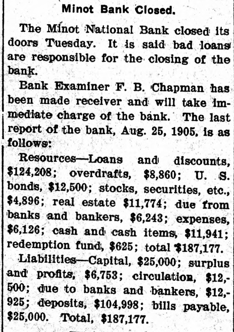 Minot Bank Closed. The Minot National Bank closed its doors Tuesday. It is said bad loans are responsible for the closing of the bank. Bank Examiner F. B. Chapman has been made receiver and will take immediate charge of the bank. The last report of the bank, Aug. 25, 1905, is as follows: Resources-Loans and discounts, $124,208; overdrafts, $8,860; U. S. bonds, $12,500; stocks, securities, etc., $4,896; real estate $11,774; due from banks and bankers, $6,243; expenses, $6,126; cash and cash items, $11,941; redemption fund, $625; total $187,177. Liabilities-Capital, $25,000; surplus and profits, $6,753; circulation, $12,500; due to banks and bankers, $12,925; deposits, $104,998; bills payable, $25,000. Total, $187,177.