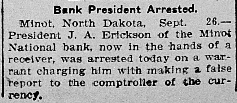Bank President Arrested. Minot, North Dakota, Sept. 26.President J. A. Erickson of the Minot National bank, now in the hands of a receiver, was arrested today on a warrant charging him with making a false report to the comptroller of the currency.