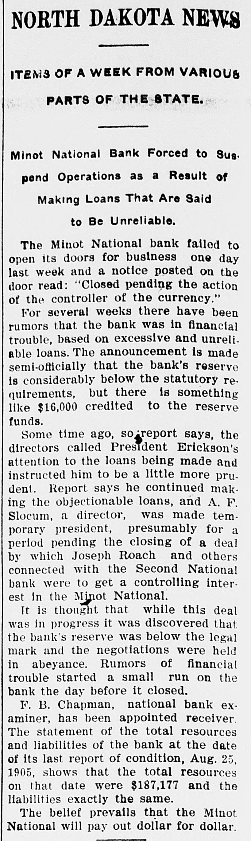 ITEMS OF A WEEK FROM VARIOUS PARTS OF THE STATE. Minot National Bank Forced to Sus. pend Operations as a Result of Making Loans That Are Said to Be Unreliable. The Minot National bank failed to open its doors for business one day last week and a notice posted on the door read: "Closed pending the action of the controller of the currency." For several weeks there eve been financial rumors that the bank was trouble, based on excessive and unreliable loans. The announcement is made semi-officially that the bank's reserve is considerably below the statutory requirements, but there is something like $16,000 credited to the reserve funds. Some time ago, so report says, the directors called President Erickson's attention to the loans being made and instructed him to be a little more prudent. Report says he continued making the objectionable loans, and A. F. Slocum, a director, was made temporary president, presumably for a period pending the closing of a deal by which Joseph Roach and others connected with the Second National bank were to get a controlling interest in the Minot National. It is thought that while this deal was in progress it was discovered that the bank's reserve was below the legal mark and the negotiations were held in abeyance. Rumors of financial trouble started a small run on the bank the day before it closed. F. B. Chapman, national bank examiner, has been appointed receiver. The statement of the total resources and liabilities of the bank at the date of its last report of condition, Aug. 25, 1905, shows that the total resources on that date were $187,177 and the liabilities exactly the same. The belief prevails that the Minot National will pay out dollar for dollar.
