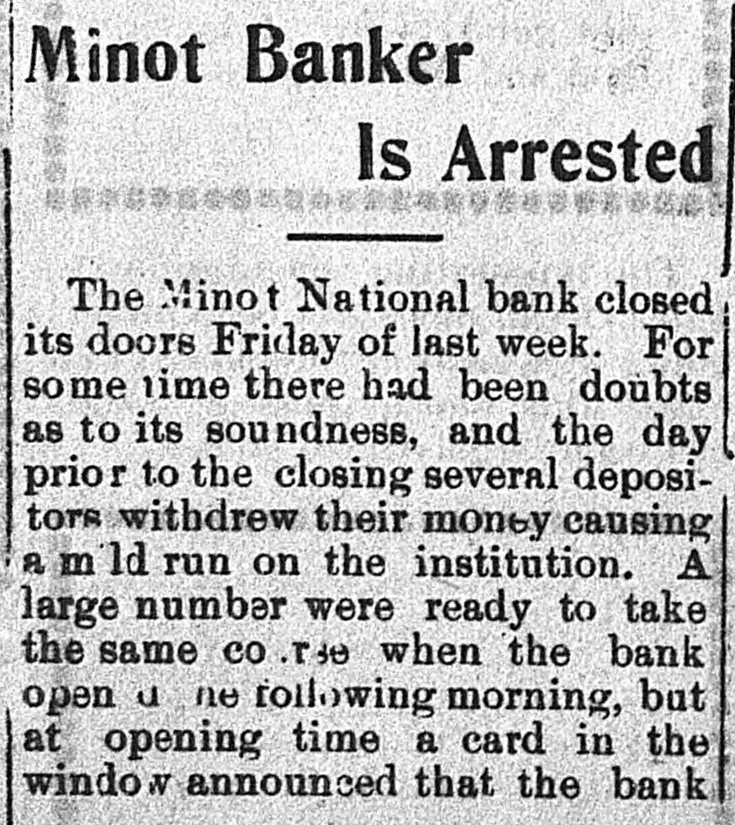 Minot Banker Is Arrested The Minot National bank closed its doors Friday of last week. For some time there had been doubts as to its soundness, and the day prior to the closing several depositors withdrew their money causing a m Id run on the institution. A large number were ready to take the same CO.T30 when the bank open u ne following morning, but at opening time a card in the windo announced that the bank