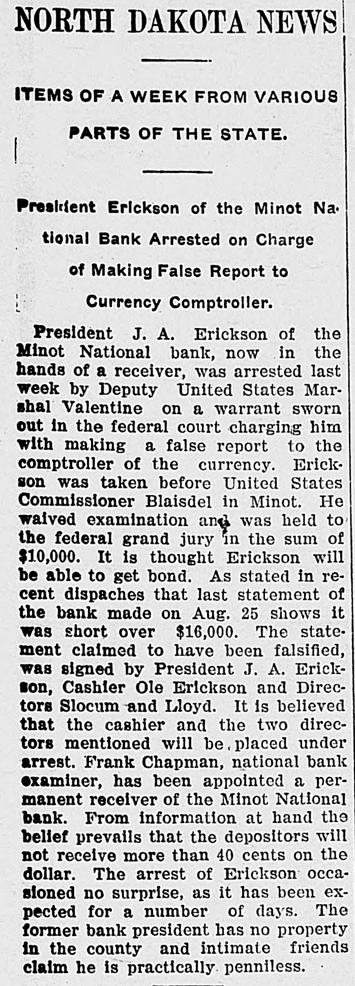 NORTH DAKOTA NEWS ITEMS OF A WEEK FROM VARIOUS PARTS OF THE STATE. President Erickson of the Minot Na. tional Bank Arrested on Charge of Making False Report to Currency Comptroller. President J. A. Erickson of the Minot National bank, now in the hands of a receiver, was arrested last week by Deputy United States Marshal Valentine on a warrant sworn out in the federal court charging him with making a false report to the comptroller of the currency. Erickson was taken before United States Commissioner Blaisdel in Minot. He waived examination and was held to the federal grand jury in the sum of $10,000. It is thought Erickson will be able to get bond. As stated in recent dispaches that last statement of the bank made on Aug. 25 shows it was short over $16,000. The statement claimed to have been falsified, was signed by President J. A. Erickson, Cashier Ole Erickson and Directors Slocum and Lloyd. It is believed that the cashier and the two directors mentioned will be, placed under arrest. Frank Chapman, national bank examiner, has been appointed a permanent receiver of the Minot National bank. From information at hand the belief prevails that the depositors will not receive more than 40 cents on the dollar. The arrest of Erickson occasioned no surprise, as it has been expected for a number of days. The former bank president has no property in the county and intimate friends claim he is practically penniless.