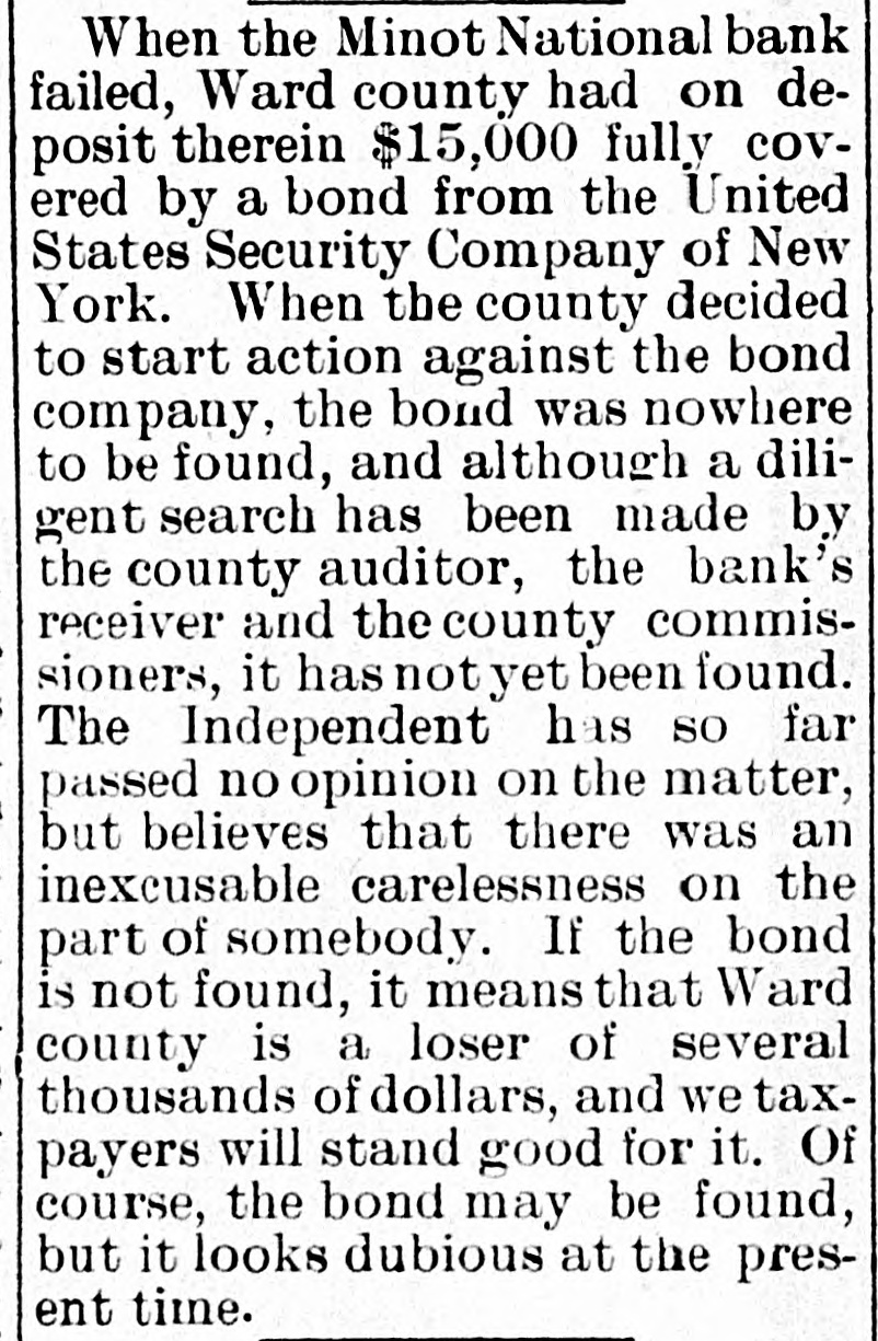 When the Minot National bank failed, Ward county had on deposit therein $15,000 fully covered by a bond from the United States Security Company of New York. When the county decided to start action against the bond company, the bond was nowhere to be found, and although a diligent search has been made by the county auditor, the bank's receiver and the county commissioners, it has not yet been found. The Independent has so far passed no opinion on the matter, but believes that there was an inexcusable carelessness on the part of somebody. If the bond is not found, it means that Ward county is a loser of several thousands of dollars, and we taxpayers will stand good for it. Of course, the bond may be found, but it looks dubious at the present time.