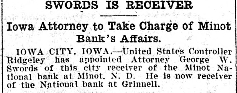 SWORDS IS RECEIVER Iowa Attorney to Take Charge of Minot Bank's Affairs. IOWA CITY, IOWA.-United States Controller Ridgeley has appointed Attorney George W. Swords of this city receiver of the Minot National bank at Minot. N. D. He is now receiver of the National bank at Grinnell.