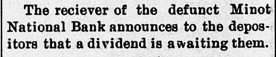 The reciever of the defunct Minot National Bank announces to the depositors that a dividend is a waiting them.