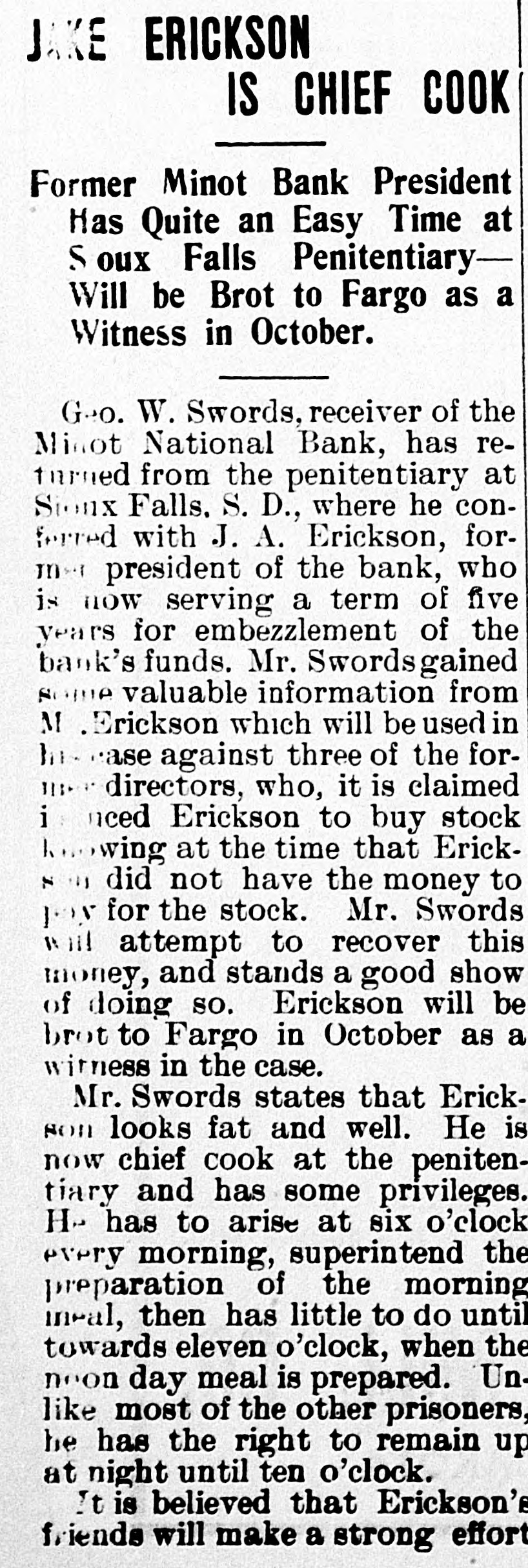 # JAKE ERICKSON # IS CHIEF COOK Former Minot Bank President Has Quite an Easy Time at Sioux Falls Penitentiary— Will be Brot to Fargo as a Witness in October. Geo. W. Swords, receiver of the Minot National Bank, has re- turned from the penitentiary at Sioux Falls, S. D., where he con- ferred with J. A. Erickson, former president of the bank, who is now serving a term of five years for embezzlement of the bank's funds. Mr. Swords gained some valuable information from M. Erickson which will be used in case against three of the for- mer directors, who, it is claimed induced Erickson to buy stock knowing at the time that Erickson did not have the money to pay for the stock. Mr. Swords will attempt to recover this money, and stands a good show of doing so. Erickson will be brot to Fargo in October as a witness in the case. Mr. Swords states that Erickson looks fat and well. He is now chief cook at the penitentiary and has some privileges. He has to arise at six o'clock every morning, superintend the preparation of the morning meal, then has little to do until towards eleven o'clock, when the noon day meal is prepared. Un- like most of the other prisoners, he has the right to remain up at night until ten o'clock. It is believed that Erickson's friends will make a strong effort