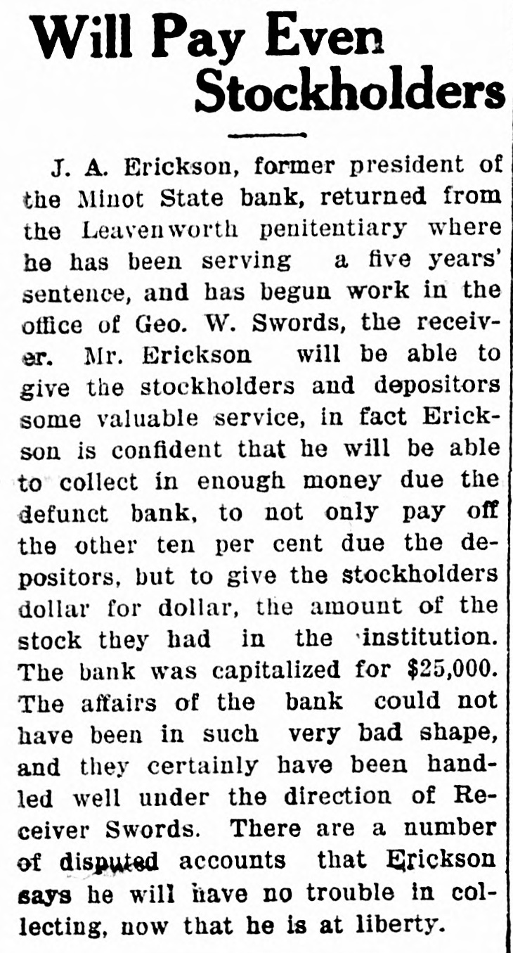 Will Pay Even Stockholders J. A. Erickson, former president of the Minot State bank, returned from the Leavenworth penitentiary where he has been serving a five years' sentence, and has begun work in the office of Geo. W. Swords, the receiver. Mr. Erickson will be able to give the stockholders and depositors some valuable service, in fact Erickson is confident that he will be able to collect in enough money due the defunct bank, to not only pay off the other ten per cent due the depositors, but to give the stockholders dollar for dollar, the amount of the stock they had in the institution. The bank was capitalized for $25,000. The affairs of the bank could not have been in such very bad shape, and they certainly have been handled well under the direction of Receiver Swords. There are a number of disputed accounts that Erickson says he will have no trouble in collecting, now that he is at liberty.