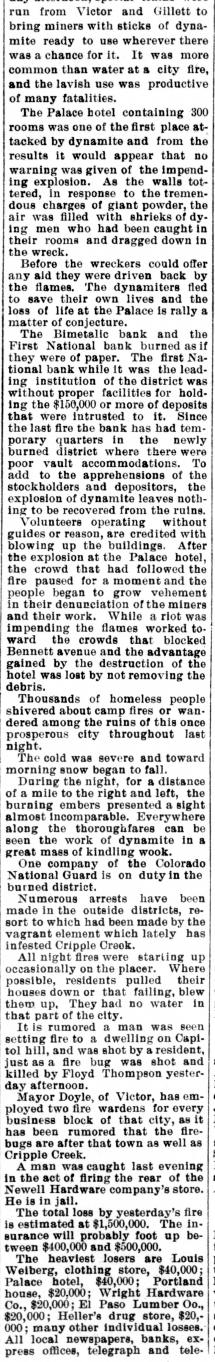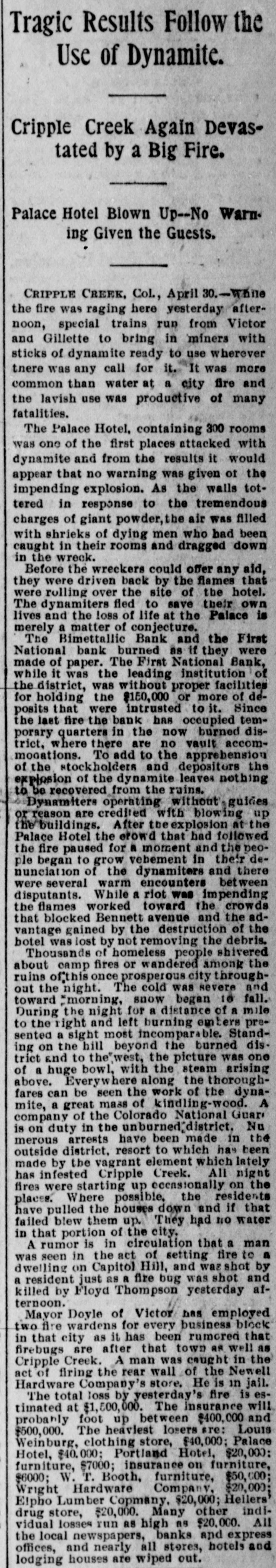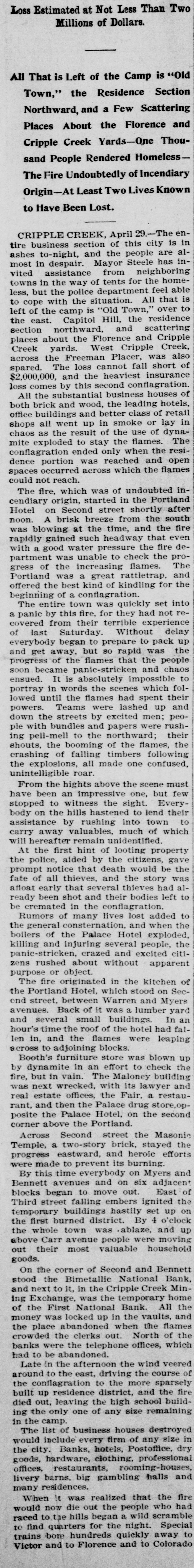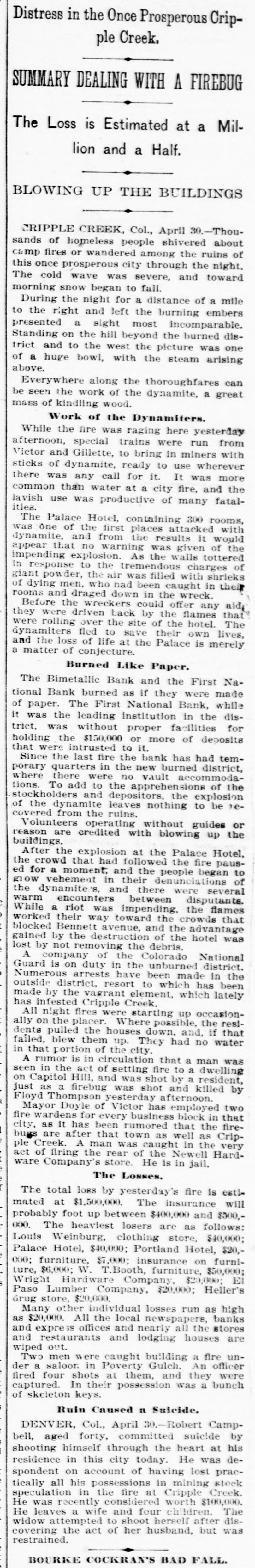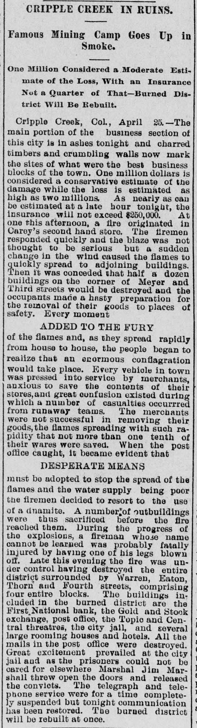 CRIPPLE CREEK IN RUINS. Famous Mining Camp Goes Up in Smoke. One Million Considered a Moderate Estimate of the Loss, With an Insurance Not a Quarter of That-Burned District Will Be Rebuilt. Cripple Creek, Col., April 25.-The main portion of the business section of this city is in ashes tonight and charred timbers and crumbling walls now mark the sites of what were the best business blocks of the town. One million dollars is considered a conservative estimate of the damage while the loss is estimated as high as two millions. As nearly as can be estimated at a late hour tonight, the insurance will not exceed $250,000. At one this afternoon, a fire originated in Carey's second hand store. The firemen responded quickly and the blaze was not thought to be serious but a sudden change in the wind caused the flames to quickly spread to adjoining buildings. Then it was conceded that half a dozen buildings on the corner of Meyer and Third streets would be destroyed and the occupants made a hasty preparation for the removal of their goods to places of safety. Every moment ADDED TO THE FURY of the flames and, as they spread rapidly from house to house, the people began to realize that an enormous conflagration would take place. Every vehicle in town was pressed into service by merchants, anxious to save the contents of their stores, and great confusion existed during which a number of casualties occurrred from runaway teams. The merchants were not successful in removing their goods, the flames spreading with such rapidity that not more than one tenth of their wares were saved. When the post office caught, it became evident that DESPERATE MEANS must be adopted to stop the spread of the flames and the water supply being poor the firemen decided to resort to the use of a dnamite. A number"of outbuildings were thus sacrificed before the fire reached them. During the progress of the explosions, a fireman whose name cannot be learned was probably fatally injured by having one of his legs blown off. Late this evening the fire was under control having destroyed the entire district surrounded by Warren, Eaton, Thorn and Fourth streets, comprising four entire blocks. The buildings included in the burned district are the First National bank, the Gold and Stock exchange, post office, the Topic and Central threatres, the city jall, and several large rooming houses and hotels. All the mails in the post office were destroyed. Great excitement prevailed at the city jail and as the prisoners could not be cared for elsewhere Marshal Jim Marshall threw open the doors and released the convicts. The telegraph and telephone service were for a time completely suspended but tonight communication has been restored. The burned district will be rebuilt at once.