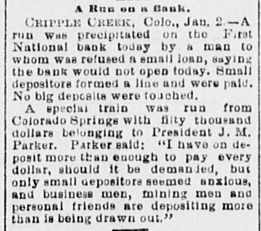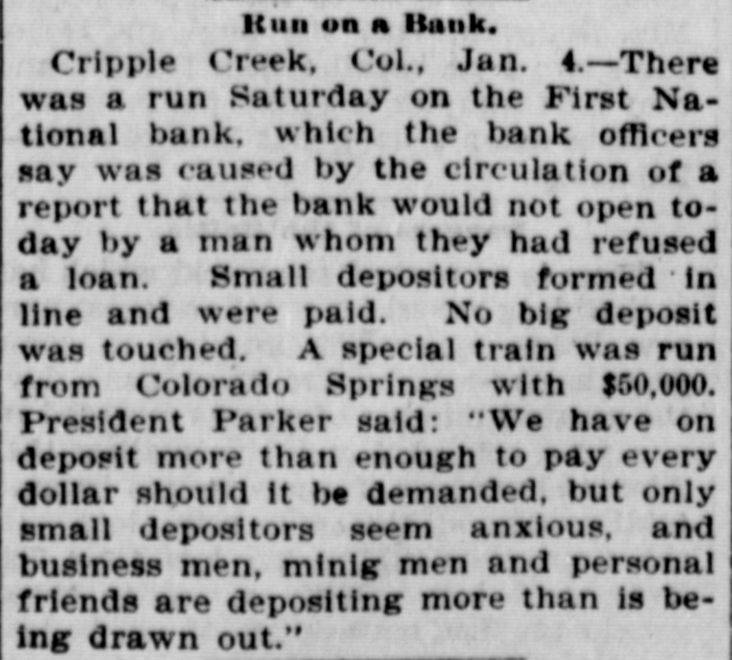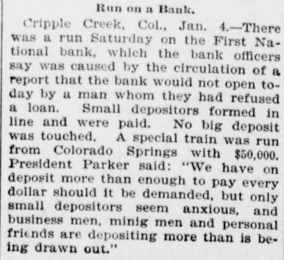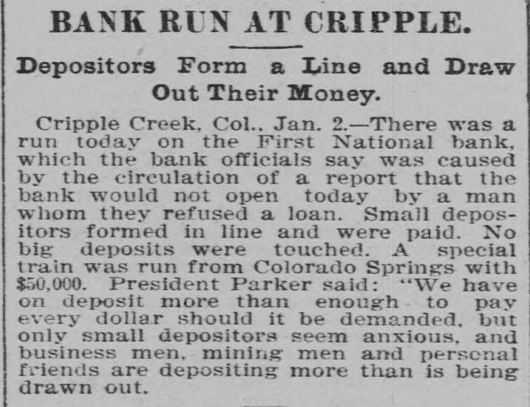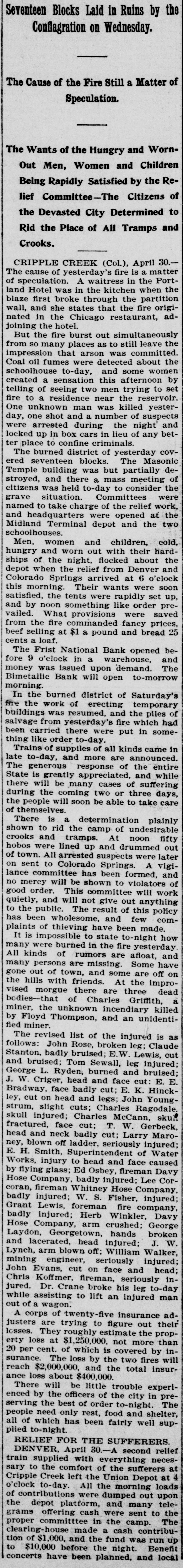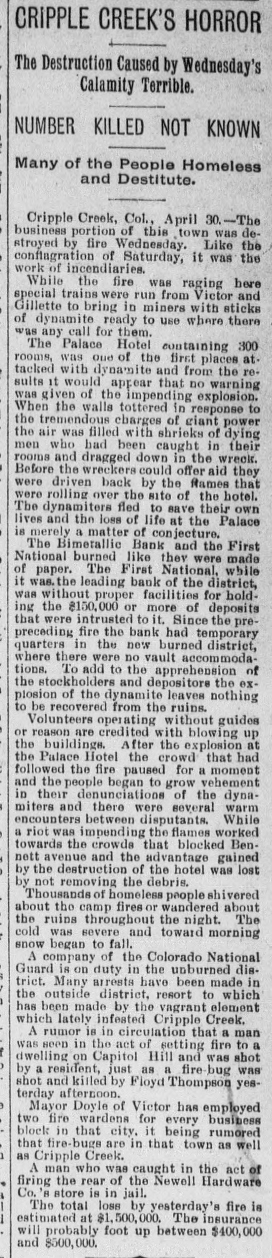 CRIPPLE CREEK IN RUINS. Famous Mining Camp Goes Up in Smoke. One Million Considered a Moderate Estimate of the Loss, With an Insurance Not a Quarter of That-Burned District Will Be Rebuilt. Cripple Creek, Col., April 25.-The main portion of the business section of this city is in ashes tonight and charred timbers and crumbling walls now mark the sites of what were the best business blocks of the town. One million dollars is considered a conservative estimate of the damage while the loss is estimated as high as two millions. As nearly as can be estimated at a late hour tonight, the insurance will not exceed $250,000. At one this afternoon, a fire originated in Carey's second hand store. The firemen responded quickly and the blaze was not thought to be serious but a sudden change in the wind caused the flames to quickly spread to adjoining buildings. Then it was conceded that half a dozen buildings on the corner of Meyer and Third streets would be destroyed and the occupants made a hasty preparation for the removal of their goods to places of safety. Every moment ADDED TO THE FURY of the flames and, as they spread rapidly from house to house, the people began to realize that an enormous conflagration would take place. Every vehicle in town was pressed into service by merchants, anxious to save the contents of their stores, and great confusion existed during which a number of casualties occurrred from runaway teams. The merchants were not successful in removing their goods, the flames spreading with such rapidity that not more than one tenth of their wares were saved. When the post office caught, it became evident that DESPERATE MEANS must be adopted to stop the spread of the flames and the water supply being poor the firemen decided to resort to the use of a dnamite. A number"of outbuildings were thus sacrificed before the fire reached them. During the progress of the explosions, a fireman whose name cannot be learned was probably fatally injured by having one of his legs blown off. Late this evening the fire was under control having destroyed the entire district surrounded by Warren, Eaton, Thorn and Fourth streets, comprising four entire blocks. The buildings included in the burned district are the First National bank, the Gold and Stock exchange, post office, the Topic and Central threatres, the city jall, and several large rooming houses and hotels. All the mails in the post office were destroyed. Great excitement prevailed at the city jail and as the prisoners could not be cared for elsewhere Marshal Jim Marshall threw open the doors and released the convicts. The telegraph and telephone service were for a time completely suspended but tonight communication has been restored. The burned district will be rebuilt at once.