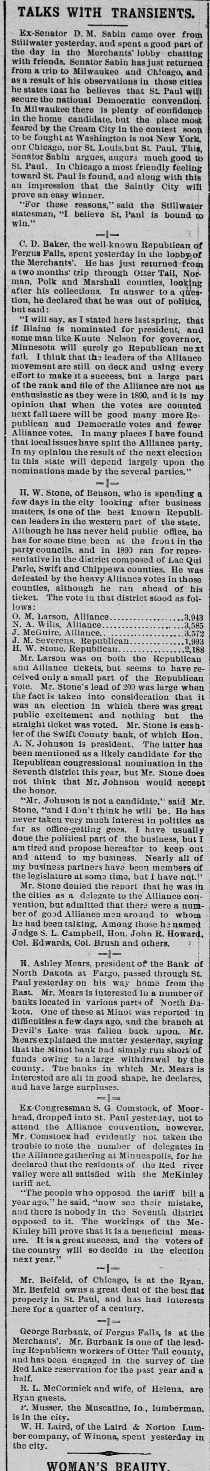 H. W. Stone, of Benson, who is spending a few days in the city looking after business matters, is one of the best known Republican leaders in the western part of the state. Although he has never held public office, he has for some time been at the front in the party councils, and in 1890 ran for representative in the district composed of Lac Qui Parle, Swift and Chippewa counties. He was defeated by the heavy Alliance votes in those counties, although he ran ahead of his ticket. The vote in that district stood as follows: