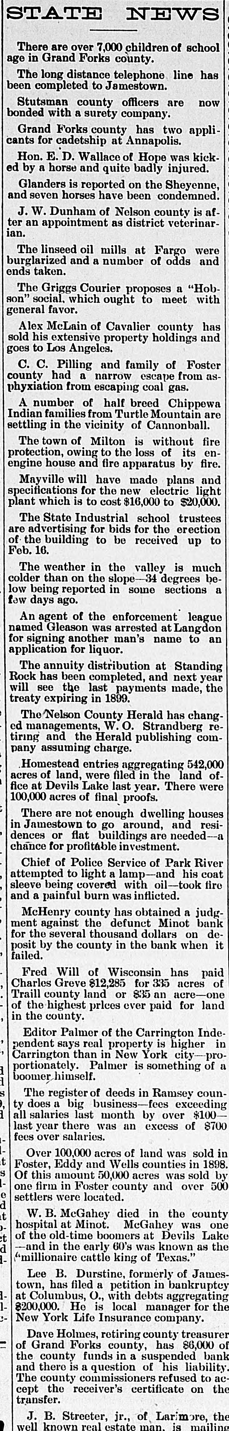 STATE NEWS There are over 7,000 children of school age in Grand Forks county. The long distance telephone line has been completed to Jamestown. Stutsman county officers are now bonded with a surety company. Grand Forks county has two applicants for cadetship at Annapolis. Hon. E. D. Wallace of Hope was kicked a by horse and quite badly injured. Glanders is reported on the Sheyenne, and seven horses have been condemned. J. W. Dunham of Nelson county is after an appointment as district veterinarian. The linseed oil mills at Fargo were burglarized and a number of odds and ends taken. The Griggs Courier proposes a "Hobson" social, which ought to meet with general favor. Alex McLain of Cavalier has and sold his Los extensive property holdings county goes to Angeles. C. Pilling and family of Foster a narrow from ascounty had escape phyxiation from escaping coal gas. A number of half breed Chippewa Indian families from Turtle Mountain are settling in the vicinity of Cannonball. The town of Milton is without fire to the loss of its enand fire fire. protection, engine house owing apparatus by have made and the new electric specifications Mayville will for plans light plant which is to cost $16,000 to $20,000. The State Industrial school trustees are advertising for bids for the erection of the building to be received up to Feb. 16. The weather in the valley is much colder than on the slope-34 degrees below being reported in some sections a few days ago. An agent of the enforcement league was arrested at named signing Gleason Langdon for another man's name to an application for liquor. The annuity distribution at Standing Rock completed, and next see last the will has been the payments made, year treaty expiring in 1899. Herald has ed managements, W.O. reNelson County Strandberg changtiring and the Herald publishing company assuming charge. Homestead entries aggregating 542,000 acres of land, were filed in the land office at Devils Lake last year. There were 100,000 acres of final proofs. There are not enough dwelling houses to go or are dences in Jamestown flat buildings around, needed--a and resichance for profitable investment. Service of to light a attempted Chief of Police lamp-and Park River coat covered with fire a burn was and sleeve painful being inflicted. oil-took McHenry county has obtained a judgment against the defunct Minot bank for the several thousand dollars on deposit by the county in the bank when it failed. Fred Will of Wisconsin has paid Charles Greve 812,285 for 335 acres of Traill county land or $35 an acre-one of the highest prices ever paid for land in the county. Editor Palmer of the Carrington Independent says real property is higher i in Carrington than in New York city-proa portionately. Palmer is something of boomer himself. The register of deeds in Ramsey county does a big business-fees last month over all last salaries by exceeding $100 year there was an excess of $700 fees over salaries. Over 100,000 acres of land was sold in t Foster, Eddy and Wells counties in S amount 50,000 acres was sold Of this firm 1898, by one in Foster county and over 500 e settlers were located. d t W.B. McGahey died in the at Minot. McGahey was boomers at et of hospital the old-time Devils county Lake one d -and in the early 60's was known as the "millionaire cattle king of Texas.' Lee B. Durstine, formerly of James a petition in 1O., with debts 1$200,000. at town, Columbus, has filed aggregating bankruptcy He is local manager for the :Life Insurance retiring treasurer New Dave York Holmes, county company. of county, has the Grand county Forks $6,000 of funds in a suspended bank is a question of his commissioners refused and The there county liability. to accept the receiver's certificate on the transfer. J. B. Streeter, jr., of Larimore, the well known real estate man. is mailing