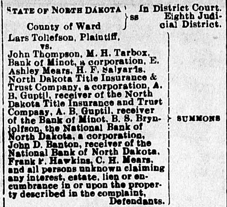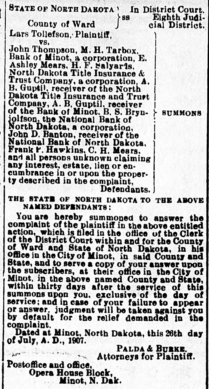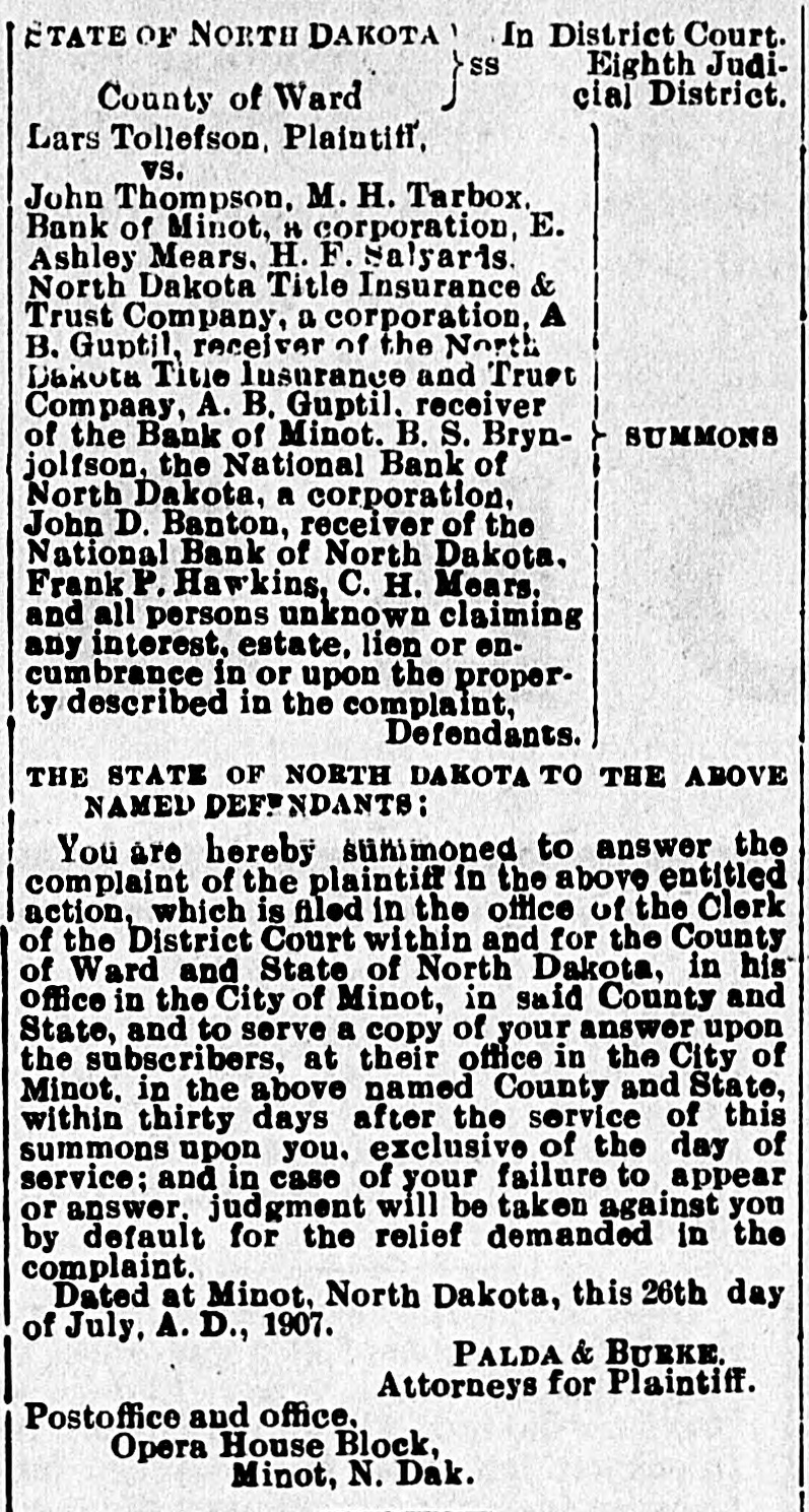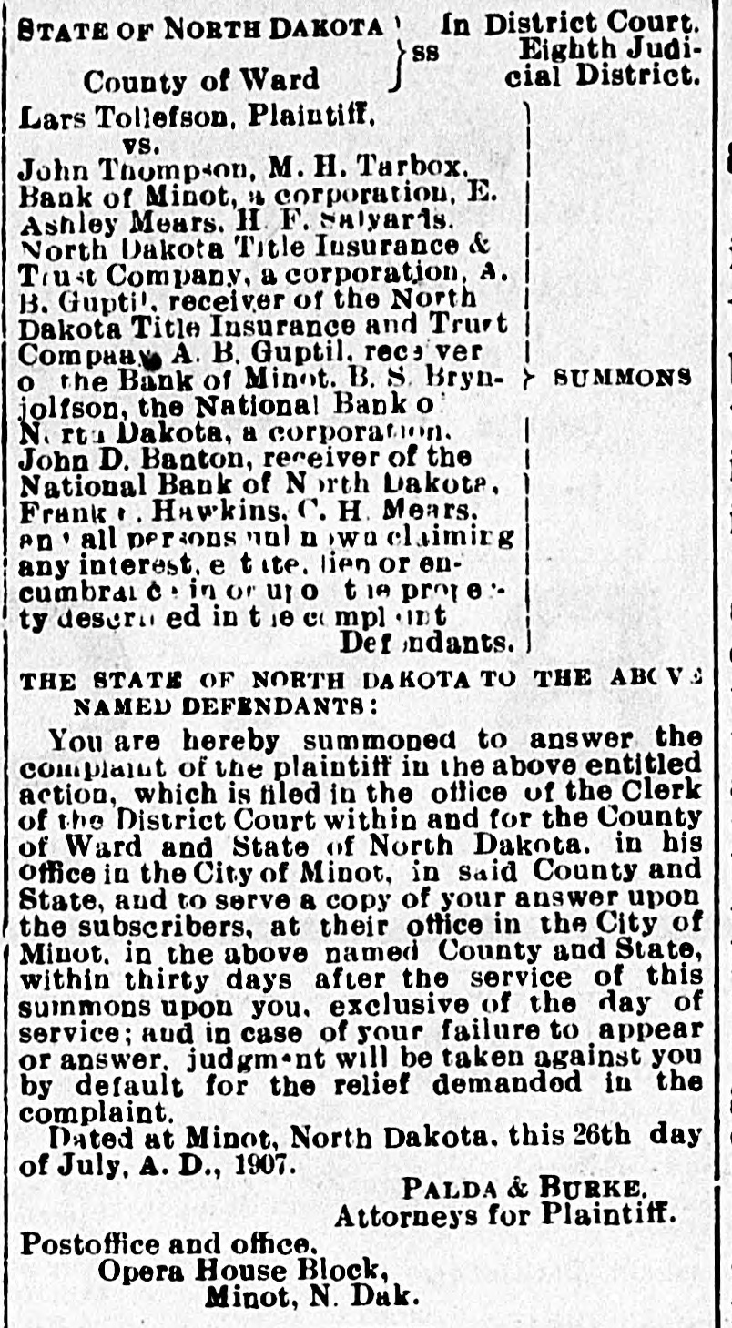 In District Court. STATE OF NORTH DAKOTA SS Eighth Judicial District. County of Ward Lars Tollefson, Plaintiff, vs. John Thompson, M. H. Tarbox. Bank of Minot, 11 corporation, E. Ashley Mears. H. F. Salyards. North Dakota Title Insurance & Trust Company, a corporation, A. B. Gupti!. receiver of the North Dakota Title Insurance and Trust Company A. B. Guptil. rece ver SUMMONS 1 o the Bank of Minot. B. S. Brynjolfson, the National Bank o N. rtn Dakota, a corporation. John D. Banton, receiver of the National Bank of N orth Dakota. Frank 1. . Hawkins. C. H. Mears. an all persons not n wa laiming any interest. e ite. lien or encumbrai è. in or up 0 t 1A prop e :ty describ ed in t 10 C mpl ant Def ndants. THE STATE OF NORTH DAKOTA TO THE ABC VE NAMED DEFENDANTS: You are hereby summoned to answer the complaint of the plaintiff in the above entitled action, which is filed in the office of the Clerk of the District Court within and for the County of Ward and State of North Dakota. in his office in the City of Minot, in said County and State, and to serve a copy of your answer upon the subscribers, at their office in the City of Minot. in the above named County and State, within thirty days after the service of this summons upon you. exclusive of the day of service; and in case of your failure to appear or answer. judgm'nt will be taken against you by default for the relief demanded in the complaint. Dated at Minot, North Dakota. this 26th day of July, A. D., 1907. PALDA & BURKE. Attorneys for Plaintiff. Postoffice and office. Opera House Block, Minot, N. Dak.