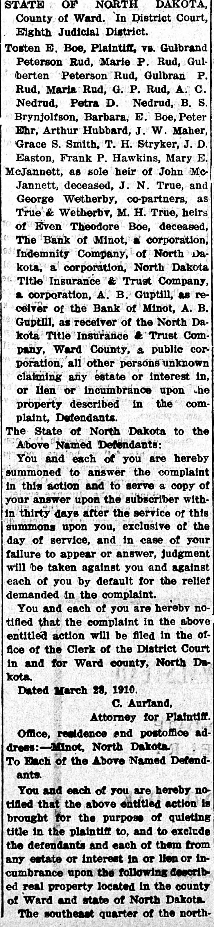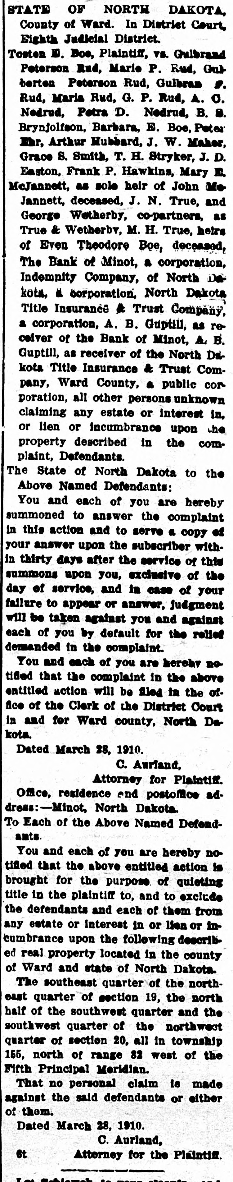 STATE OF NORTH DAKOTA, County of Ward. In District Court, Eighth Judicial District. Tosten E. Boe, Plaintiff, vs. Gulbrand Peterson Rud, Marie P. Rud, Gulberten Peterson Rud, Gulbran P. Rud, Maria Rud, G. P. Rud, A. C. Nedrud, Petra D. Nedrud, B. S. Brynjolfson, Barbara, E. Boe, Peter Ehr, Arthur Hubbard, J. W. Maher, Grace S. Smith, T. H. Stryker, J. D. Easton, Frank P. Hawkins, Mary E. McJannett, as sole heir of John McJannett, deceased, J. N. True, and George Wetherby, co-partners, as True & Wetherbv, M. H. True, heirs of Even Theodore Boe, deceased, The Bank of Minot, a corporation, Indemnity Company, of North Dakota, a corporation, North Dakota Title Insurance & Trust Company, a corporation, A. B. Guptill, as receiver of the Bank of Minot, A. B. Guptill, as receiver of the North Dakota Title Insurance & Trust Company, Ward County, a public corporation, all other persons unknown claiming any estate or interest in, or lien or incumbrance upon the property described in the complaint, Defendants. The State of North Dakota to the Above Named Defendants: You and each of you are hereby summoned to answer the complaint in this action and to serve a copy of your answer upon the subscriber within thirty days after the service of this summons upon you, exclusive of the day of service, and in case of your failure to appear or answer, judgment will be taken against you and against each of you by default for the relief demanded in the complaint. You and each of you are hereby notified that the complaint in the above entitled action will be filed in the office of the Clerk of the District Court in and for Ward county, North Dakota. Dated March 28, 1910. C. Aurland, Attorney for Plaintiff. Office, residence and postoffice address:-Minot, North Dakota. To Each of the Above Named Defendants You and each of you are hereby notified that the above entitled action is brought for the purpose of quieting title in the plaintiff to, and to exclude the defendants and each of them from any estate or interest in or lien or incumbrance upon the following described real property located in the county of Ward and state of North Dakota. The southeast quarter of the north-
