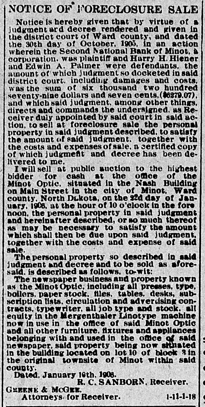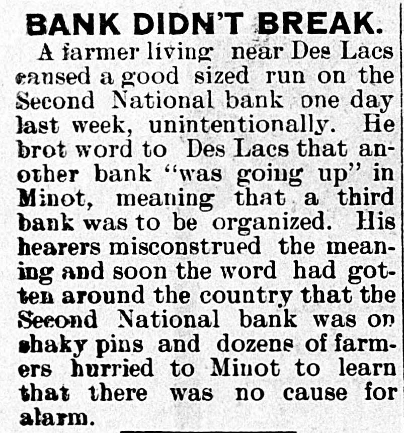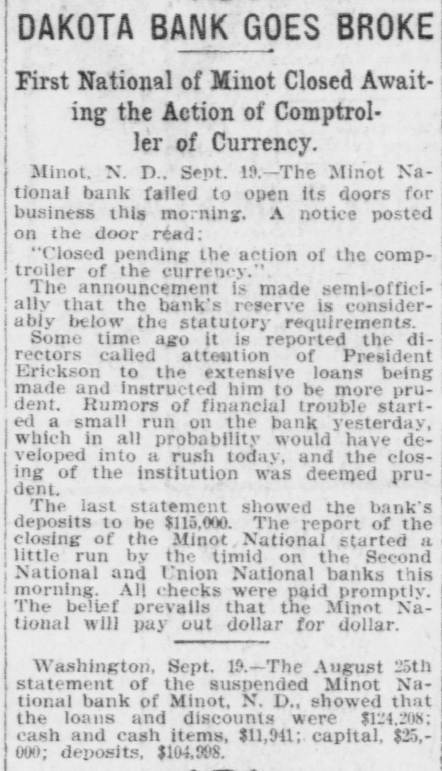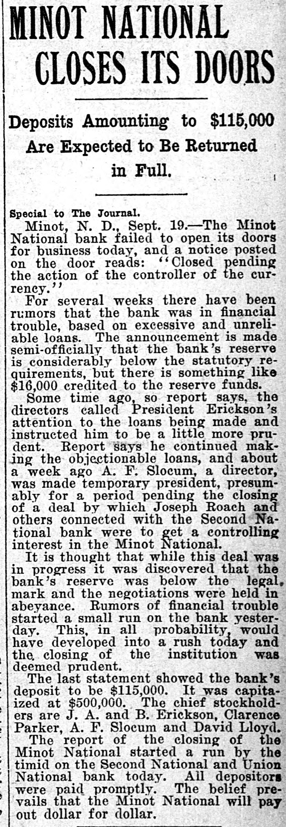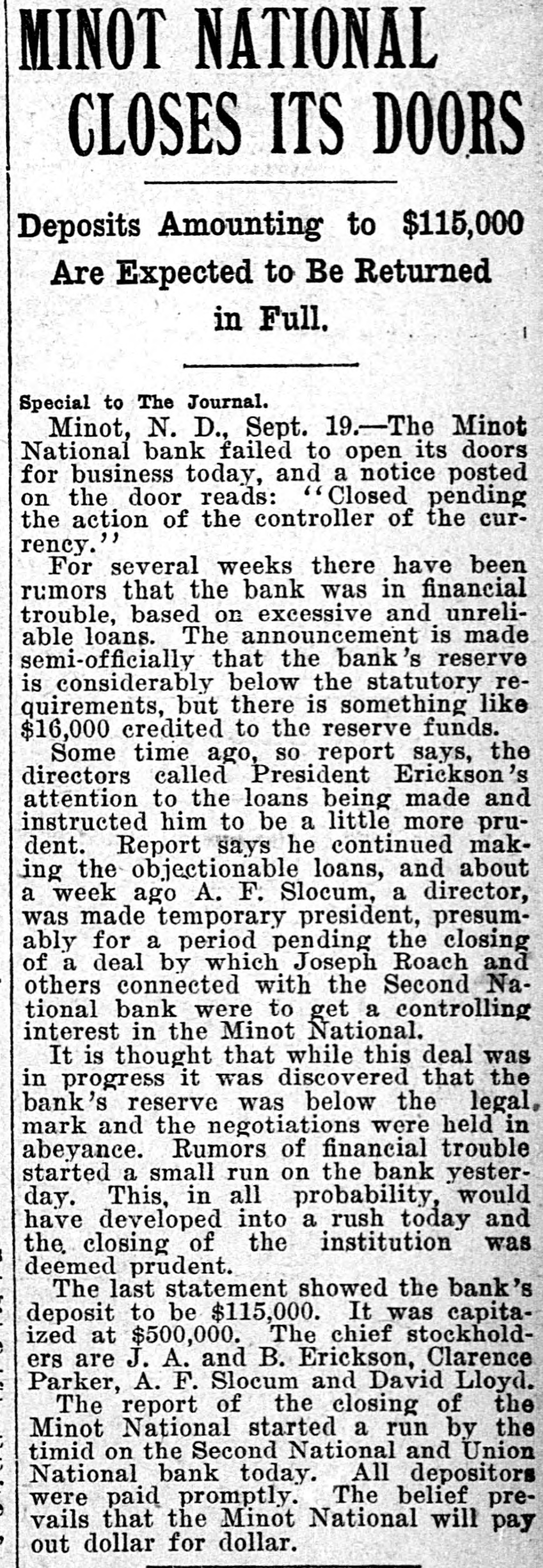 MINOT NATIONAL CLOSES ITS DOORS Deposits Amounting to $115,000 Are Expected to Be Returned in Full. Special to The Journal. Minot, N. D., Sept. 19.-The Minot National bank failed to open its doors for business today, and a notice posted on the door reads: Closed pending the action of the controller of the currency.' For several weeks there have been rumors that the bank was in financial trouble, based on excessive and unreliable loans. The announcement is made semi-officially that the bank's reserve is considerably below the statutory requirements, but there is something like $16,000 credited to the reserve funds. Some time ago, SO report says, the directors called President Erickson's attention to the loans being made and instructed him to be a little more prudent. Report says he continued making the objectionable loans, and about a week ago A. F. Slocum, a director, was made temporary president, presumably for a period pending the closing of a deal by which Joseph Roach and others connected with the Second National bank were to get a controlling interest in the Minot National. It is thought that while this deal was in progress it was discovered that the bank's reserve was below the legal® mark and the negotiations were held in abeyance. Rumors of financial trouble started a small run on the bank yesterday. This, in all probability, would have developed into a rush today and the closing of the institution was deemed prudent. The last statement showed the bank's deposit to be $115,000. It was capitaized at $500,000. The chief stockholders are J. A. and B. Erickson, Clarence Parker, A. F. Slocum and David Lloyd. The report of the closing of the Minot National started a run by the timid on the Second National and Union National bank today. All depositors were paid promptly. The belief prevails that the Minot National will pay out dollar for dollar.