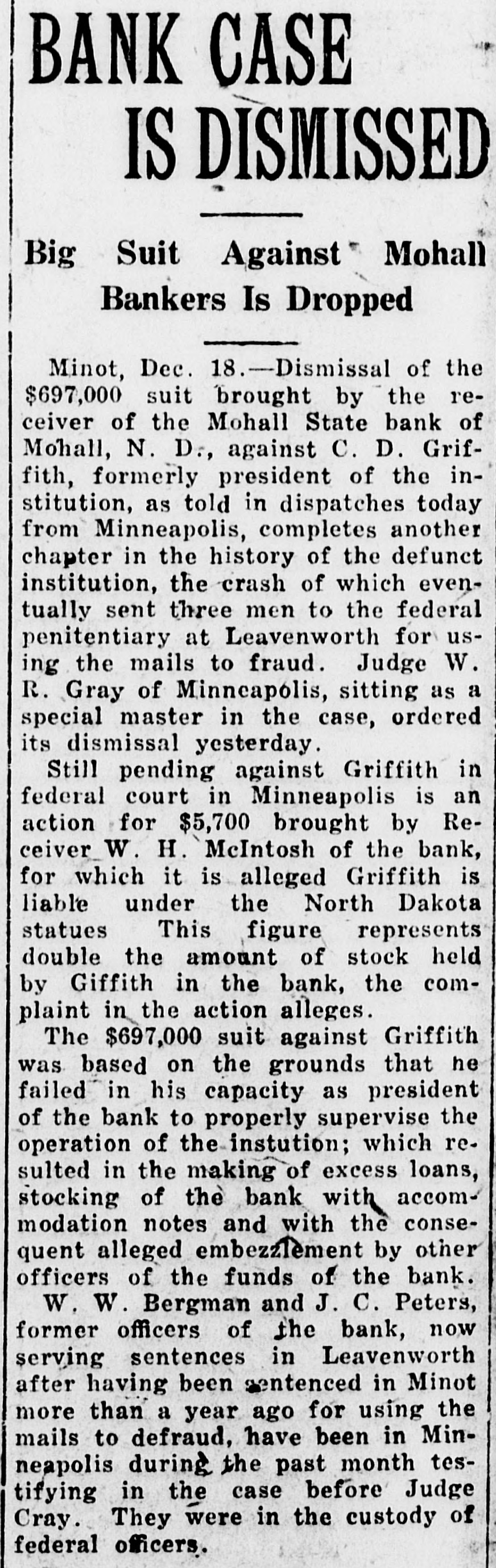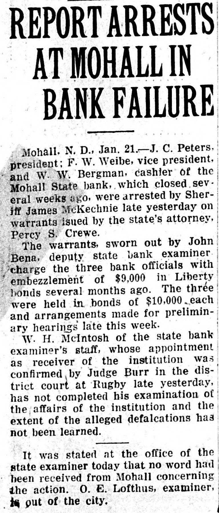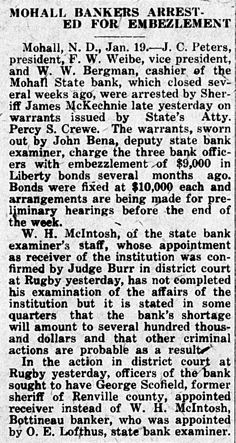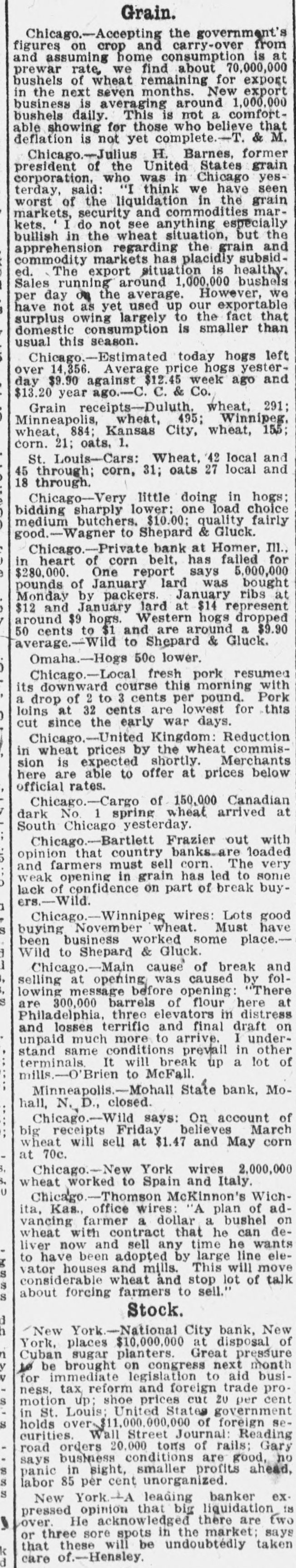 Grain. Chicago.-Accepting the government's figures on crop and carry-over from and assuming home consumption is at prewar rate, we find about 70,000,000 bushels of wheat remaining for export in the next seven months. New export business is averaging around 1,000,000 bushels daily. This is not a comfortable showing for those who believe that deflation is not yet complete.-T. & M. Chicago.-Julius H. Barnes, former president of the United States grain corporation. who was in Chicago yesterday, said: "I think we have seen worst of the liquidation in the grain markets, security and commodities markets. I do not see anything especially bullish in the wheat situation, but the apprehension regarding the grain and commodity markets has placidly subsided. The export situation is healthy. Sales running around 1,000,000 bushels per day on the average. However, we have not as yet used up our exportable surplus owing largely to the fact that domestic consumption is smaller than usual this season. Chicago.-Estimated today hogs left over 14,356. Average price hogs yesterday $9.90 against $12.45 week ago and $13.20 year ago.-C. C. & Co. Grain receipts-Duluth. wheat, 291; Minneapolis, wheat, 495; Winnipeg, wheat, 884; Kansas City, wheat, 155; corn. 21; oats, 1. St. Louis-Cars: Wheat, 42 local and 45 through; corn, 31; oats 27 local and 18 through. Chicago-Very little doing in hogs; bidding sharply lower: one load choice medium butchers. $10.00; quality fairly good.-Wagner to Shepard & Gluck. Chicago.-Private bank at Homer, III., in heart of corn belt, has failed for $280,000. One report says 5,000,000 pounds of January lard was bought Monday by packers. January ribs at $12 and January lard at $14 represent around $9 hogs. Western hogs dropped 50 cents to $1 and are around a $9.90 average.-Wild to Shepard & Gluck. Omaha.-Hogs 50c lower. Chicago.-Local fresh pork resumed its downward course this morning with a drop of 2 to 3 cents per pound. Pork loins at 32 cents are lowest for this cut since the early war days. Chicago.-United Kingdom: Reduction in wheat prices by the wheat commission is expected shortly. Merchants here are able to offer at prices below official rates. Chicago.-Cargo of 150,000 Canadian dark No. 1 spring wheat arrived at South Chicago yesterday. Chicago.-Bartlett Frazier out with opinion that country banks are loaded and farmers must sell corn. The very weak opening in grain has led to some lack of confidence on part of break buyers.-Wild. Chicago.-Winnipeg wires: Lots good buying November wheat. Must have been business worked some place.Wild to Shepard & Gluck. Chicago.-Main cause of break and selling at opening was caused by following message before opening: "There are 300,000 barrels of flour here at Philadelphia, three elevators in distress and losses terrific and final draft on unpaid much more to arrive. I understand same conditions prevail in other terminals. It will break up a lot of mills.-O'Brien to McFall. Minneapolis.-Mohall State bank, Mohall, N. D., closed. Chicago.-Wild says: On account of big receipts Friday believes March wheat will sell at $1.47 and May corn at 70c. Chicago.-New York wires 2,000,000 wheat worked to Spain and Italy. Chicago.-Thomson McKinnon's Wichita, Kas., office wires: "A plan of advancing farmer a dollar a bushel on wheat with contract that he can deliver now and sell any time he wants to have been adopted by large line elevator houses and mills. This will move considerable wheat and stop lot of talk about foreing farmers to sell." Stock. New York-National City bank, New York, places $10,000,000 at disposal of Cuban sugar planters. Great pressure be brought on congress next month for immediate legislation to aid business, tax reform and foreign trade promotion up; shoe prices cut ZU per cent in St. Louis; United States government holds over-$11,000,000,000 of foreign securities. Wall Street Journal: Reading road orders 20,000 tons of rails; Gary says business conditions are good, no panic in sight, smaller profits ahead, labor 85 per cent unorganized. New York-1A leading banker expressed opinion that big liquidation is over. He acknowledged there are two or three sore spots in the market; says that these will be undoubtedly taken care of.-Hensley.
