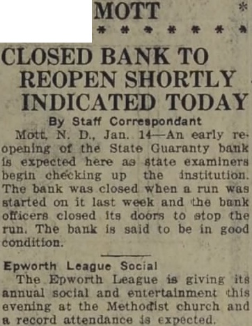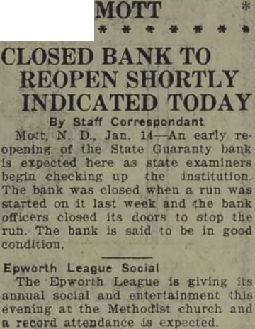By Staff Correspondant Moth, N. D., Jan. 14-An early re opening of the State Guaranty bank expected here as state examiners begin checking up the institution The bank when run was started on last week and the bank officers closed its doors to stop the run. The bank said to be in good condition.