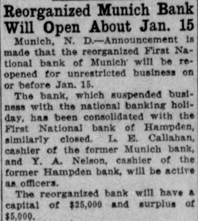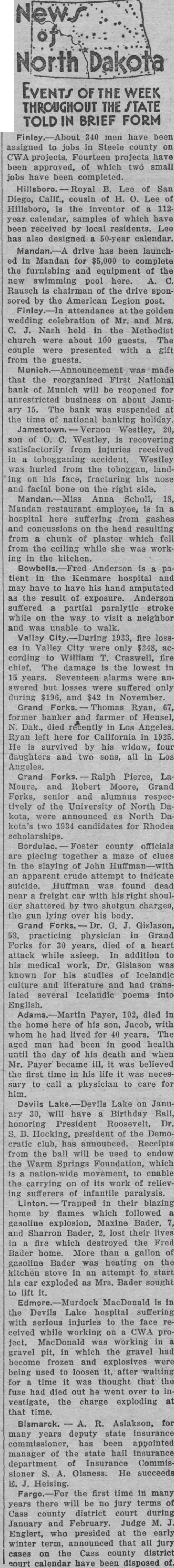 340 have been assigned to jobs in Steele county projects. Fourteen projects have been approved, of which small have been completed. Lee of San Diego, cousin of Lee of Hillsboro, the inventor of 112calendar, samples which have been received local residents. Lee has also designed 50-year calendar. drive has been launchin Mandan for to complete the furnishing and equipment the new swimming pool here. Rausch chairman of the drive sponsored by the American Legion post. attendance the golden wedding celebration of Mr. and Mrs. Nash held the Methodist church about 100 guests. couple were presented with from the guests. that the reorganized First National bank Munich will be reopened for unrestricted business on about 15. The bank was suspended the time of national banking holiday. Westley, 20, of Westley, is recovering satisfactorily from injuries received tobogganing accident. Westley hurled from the toboggan, ing his face, fracturing his and facial bone the right side. Anna Scholl, 18, Mandan restaurant employee, hospital here suffering from gashes and concussions on the head resulting from chunk of plaster which fell from the ceiling while she workin the kitchen. Anderson tient in the Kenmare hospital and may have to have his hand amputated the result of exposure. Anderson suffered partial paralytic stroke while on the way to visit neighbor and was unable to walk. Valley 1933, fire lossin Valley City only $248, according to William Craswell, fire chief. The damage the lowest in 15 years. Seventeen alarms answered but losses suffered only during $196, and November. Grand Ryan, 67, former banker farmer of Hensel, Dak., died recently in Los Angeles. Ryan left here for California in 1925. He survived by his widow, four daughters and sons, all in Los Angeles. Pierce, Moure, and Robert Moore, Grand Forks, senior and alumnus respectively of the University of North kota, announced North Datwo candidates for Rhodes scholarships. county officials piecing together maze of clues in the slaying of John apparent crude attempt to indicate suicide. Huffman was found dead freight car with shoulshattered by two shotgun charges, the gun over his body. Grand Gislason, 58, practicing physician Grand Forks for 30 years, died of heart attack while asleep. In addition his medical work, Dr. Gislason was known for his studies of Icelandic culture and literature and had lated several Icelandic poems into English. Payer, 102, died in the home here of his Jacob, with whom he had lived for 40 years. The aged had been good health until the day of his death and Mr. Payer became ill, was believed the first time in his life was to call physician to care for him. Devils Lake on January 30, will have Birthday Ball, honoring President Roosevelt, Hocking, president of the Democratic club, has amounced. Receipts from the ball will be used to endow the Warm Springs Foundation, which to carrying its work of relievsufferers infantile paralysis. their blazing home flames which followed gasoline explosion, Maxine Bader, and Bader, lost their fire which destroyed the Fred Bader home. More than gallon of gasoline Bader heating on the kitchen stove in an attempt to start his car exploded Mrs. Bader sought the Devils Lake hospital suffering serious injuries to the face ceived while working on CWA proMacDonald working gravel in which the gravel had become frozen and explosives being used loosen after for time was thought that the fuse had died out he went over to investigate, the charge exploding that time.