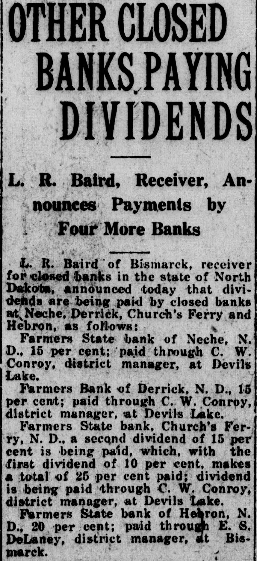 Farmers State bank of Neche, N. D., 15 per cent; paid through C. W. Conroy, district manager, at Devils Lake. ... L. R. Baird of Bismarck, receiver for closed banks in the state of North Dakota, announced today that dividends are being paid by closed banks at Neche ... 15 per cent; paid through C. W. Conroy, district manager, at Devils Lake.