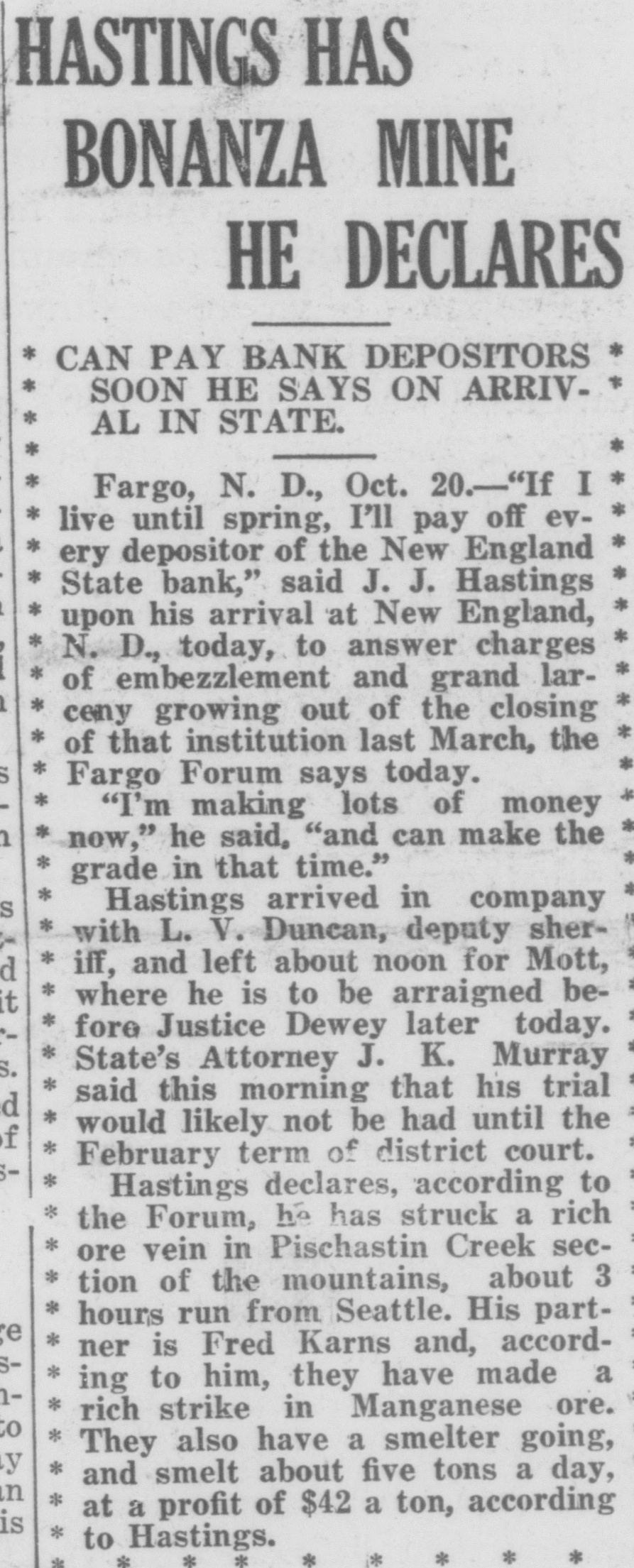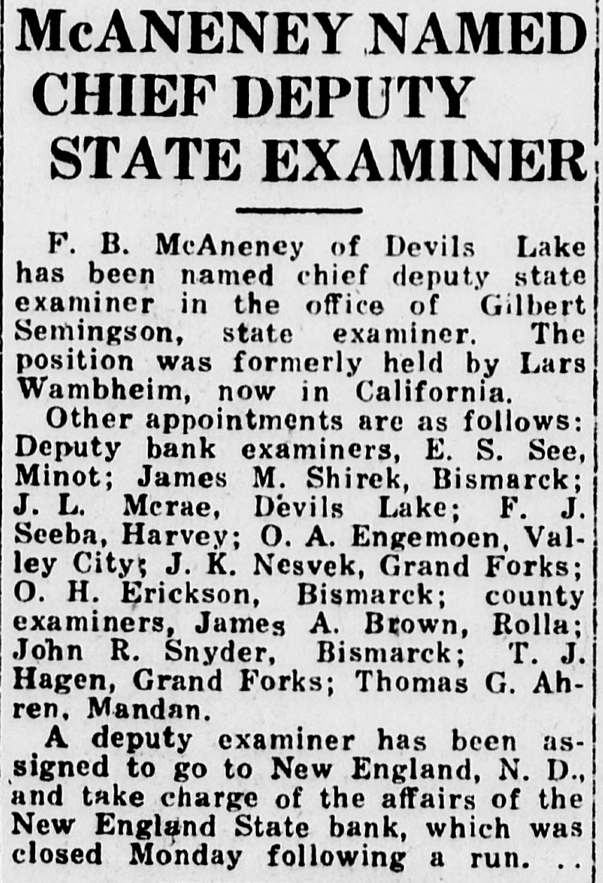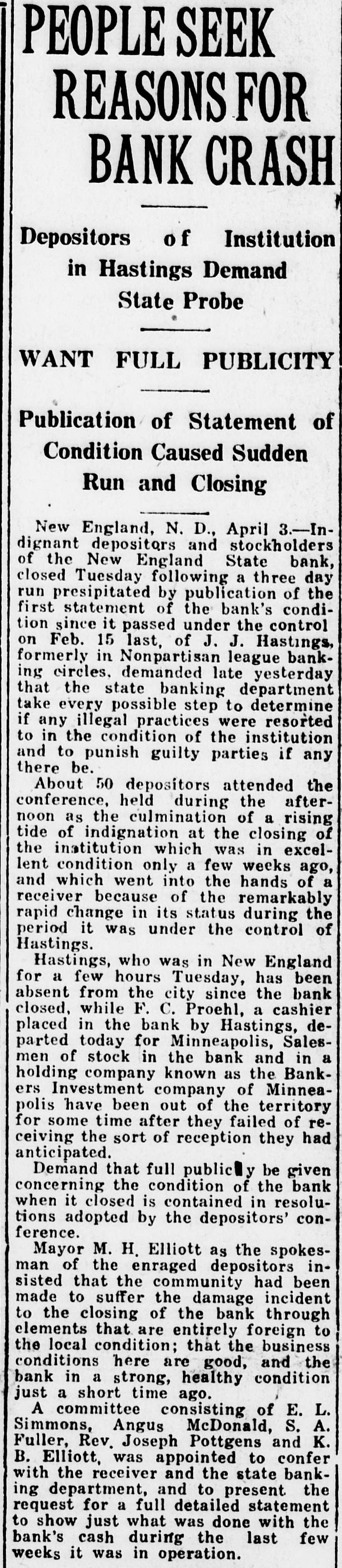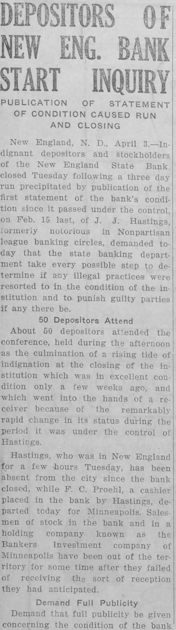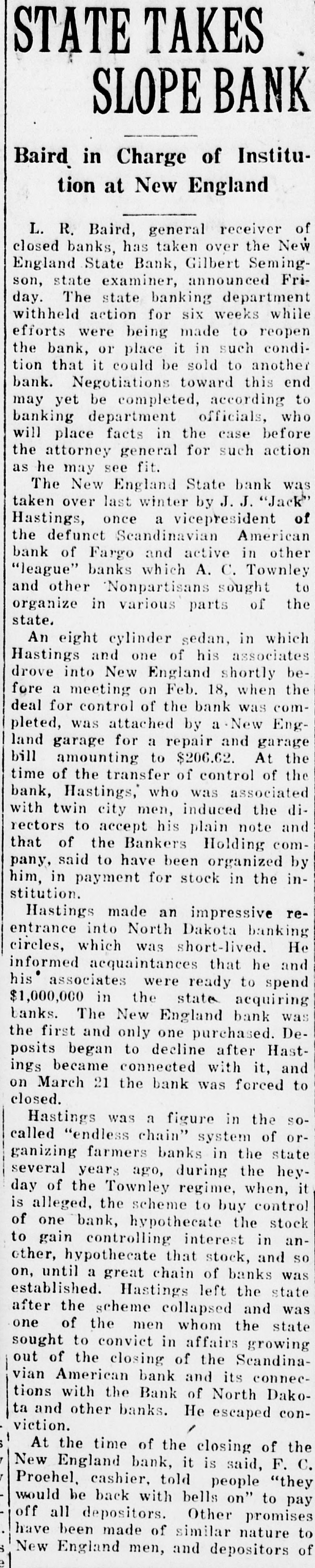 STATE TAKES SLOPE BANK Baird in Charge of Institution at New England L. R. Baird, general receiver of closed banks, has taken over the New England State Bank, Gilbert Semingson, state examiner, announced Friday. The state banking department withheld action for six weeks while efforts were being made to reopen the bank, or place it in such condition that it could be sold to another bank. Negotiations toward this end may yet be completed, according to banking department officials, who will place facts in the case before the attorney general for such action as he may see fit. The New England State bank was taken over last winter by J. J. "Jack" Hastings, once a vicepresident of the defunct Seandinavian American bank of Fargo and active in other "league" banks which A. C. Townley and other Nonpartisans sought to organize in various parts of the state. An eight cylinder sedan, in which Hastings and one of his associates drove into New England shortly before a meeting on Feb. 18, when the deal for control of the bank was completed, was attached by a New England garage for a repair and garage bill amounting to $206.62. At the time of the transfer of control of the bank, Hastings," who was associated with twin city men, induced the directors to accept his plain note and that of the Bankers Holding company, said to have been organized by him, in payment for stock in the institution. Hastings made an impressive reentrance into North Dakota banking circles, which was short-lived. He informed acquaintances that he and his' associates were ready to spend $1,000,000 in the state acquiring banks. The New England bank was the first and only one purchased. Deposits began to decline after Hastings became connected with it, and on March 21 the bank was forced to closed. Hastings was a figure in the socalled "endless chain" system of organizing farmers banks in the state several years ago, during the heyday of the Townley regime, when, it is alleged, the scheme to buy control of one bank, hypothecate the stock