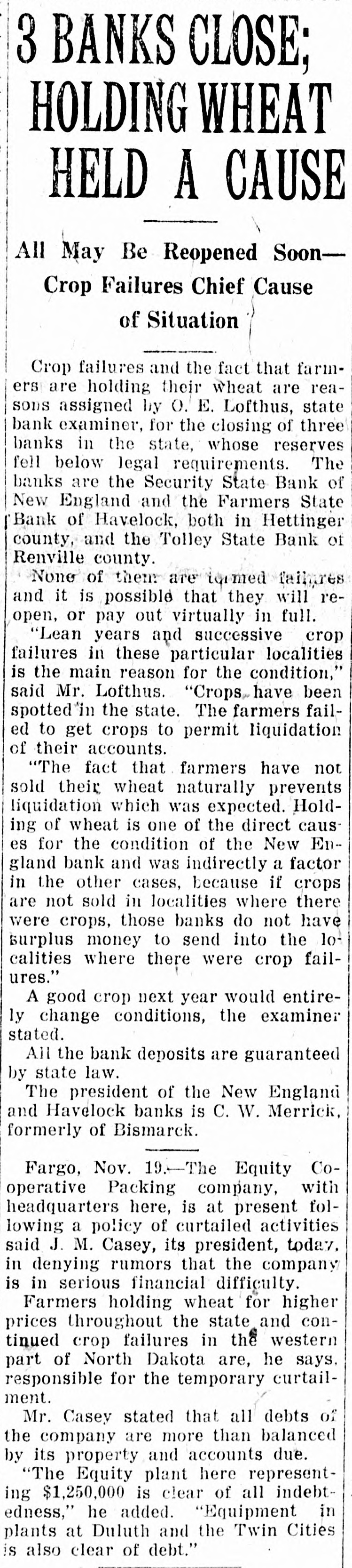 3 BANKS CLOSE; HOLDING WHEAT HELD A CAUSE All May Be Reopened SoonCrop Failures Chief Cause of Situation Crop failures and the fact that farmers are holding their wheat are reasons assigned by O. E. Lofthus, state bank examiner, for the closing of three banks in the state, whose reserves fell below legal requirements. The banks are the Security State Bank of New England and the Farmers State Bank of Havelock, both in Hettinger county, and the Tolley State Bank of Renville county. None of them are and it is possible that they will reopen, or pay out virtually in full. "Lean years and successive crop failures in these particular localities is the main reason for the condition," said Mr. Lofthus. "Crops have been spotted 'in the state. The farmers failed to get crops to permit liquidation of their accounts. "The fact that farmers have not sold their wheat naturally prevents liquidation which was expected. Holding of wheat is one of the direct causes for the condition of the New England bank and was indirectly a factor in the other cases, because if crops are not sold in localities where there were crops, those banks do not have surplus money to send into the lo calities where there were crop failures." A good crop next year would entirely change conditions, the examiner stated. All the bank deposits are guaranteed by state law. The president of the New England and Havelock banks is C. W. Merrick, formerly of Bismarck. Fargo, Nov. 19.-The Equity Cooperative Packing company, with headquarters here, is at present following a policy of curtailed activities said J. M. Casey, its president, today. in denying rumors that the company is in serious financial difficulty. Farmers holding wheat for higher prices throughout the state and continued crop failures in the western part of North Dakota are, he says. responsible for the temporary curtailment. Mr. Casey stated that all debts of the company are more than balanced by its property and accounts due. "The Equity plant here representing $1,250,000 is clear of all indebtedness," he added. "Equipment in plants at Duluth and the Twin Cities is also clear of debt."