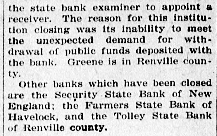 the state bank examiner to appoint a receiver. The reason for this institution closing was its inability to meet the unexpected demand for withdrawal of public funds deposited with the bank. Greene is in Renville county. Other banks which have been closed are the Security State Bank of New England; the Farmers State Bank of Havelock, and the Tolley State Bank of Renville county.